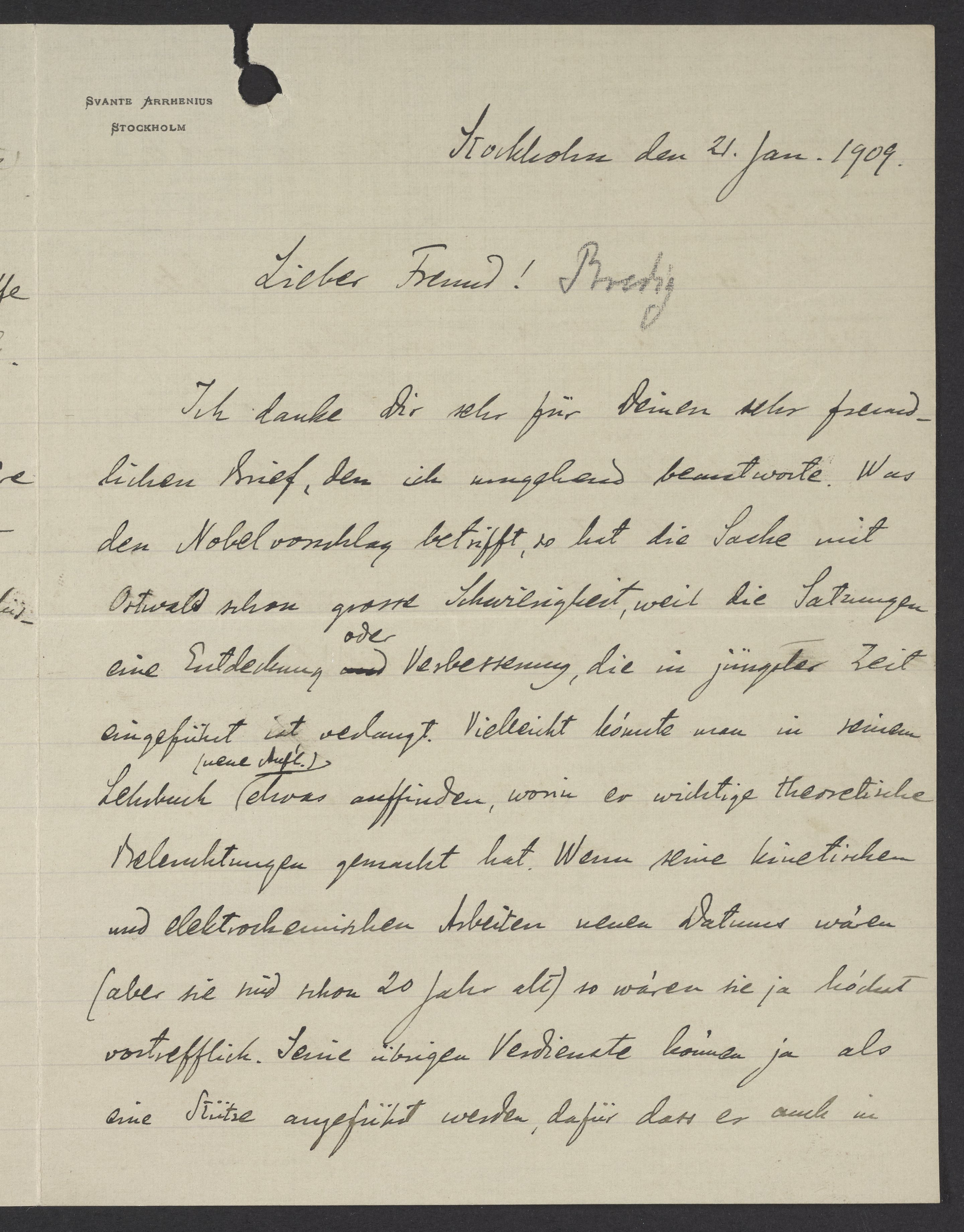 Letter from Svante Arrhenius to Georg Bredig, January 1909