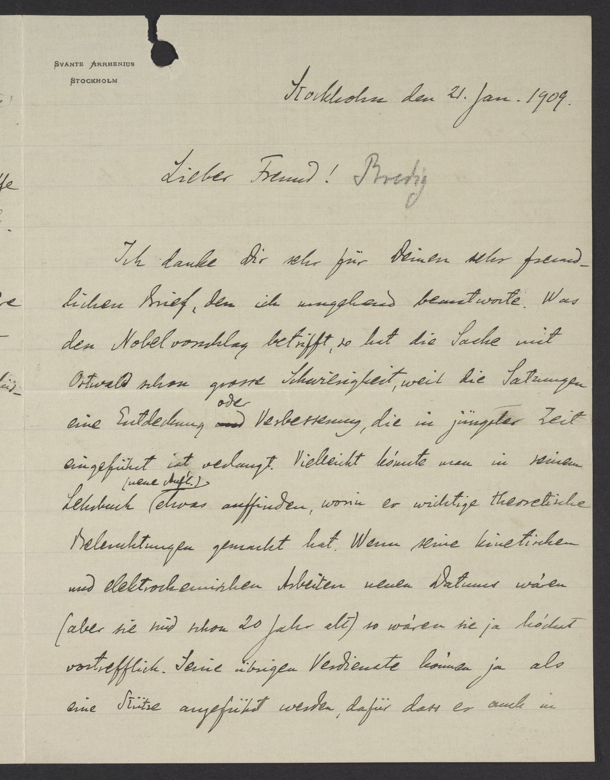Ich danke Dir sehr für Deinen sehr freundlichen Brief, den ich umgehend beantworte. Was den Nobelvorschlag betrifft, so hat die Sache mit Ostwald schon grosse Schwierigkeit, weil die Satzungen eine Entdeckung oder Verbesserung, die in jüngster Zeit eingeführt ist, verlangt. Vielleicht könnte man in seinem Lehrbuch (neue Aufl.) etwas auffinden, worin er wichtige theoretische Beleuchtungen gemacht hat. Wenn seine kinetischen und elektrochemischen Arbeiten neuen Datums wären (aber sie sind schon 20 Jahre alt) so wären sie ja höchst vortrefflich. Seine übrigen Verdienste können ja als eine Stütze ausgeführt werden, dafür dass er auch in