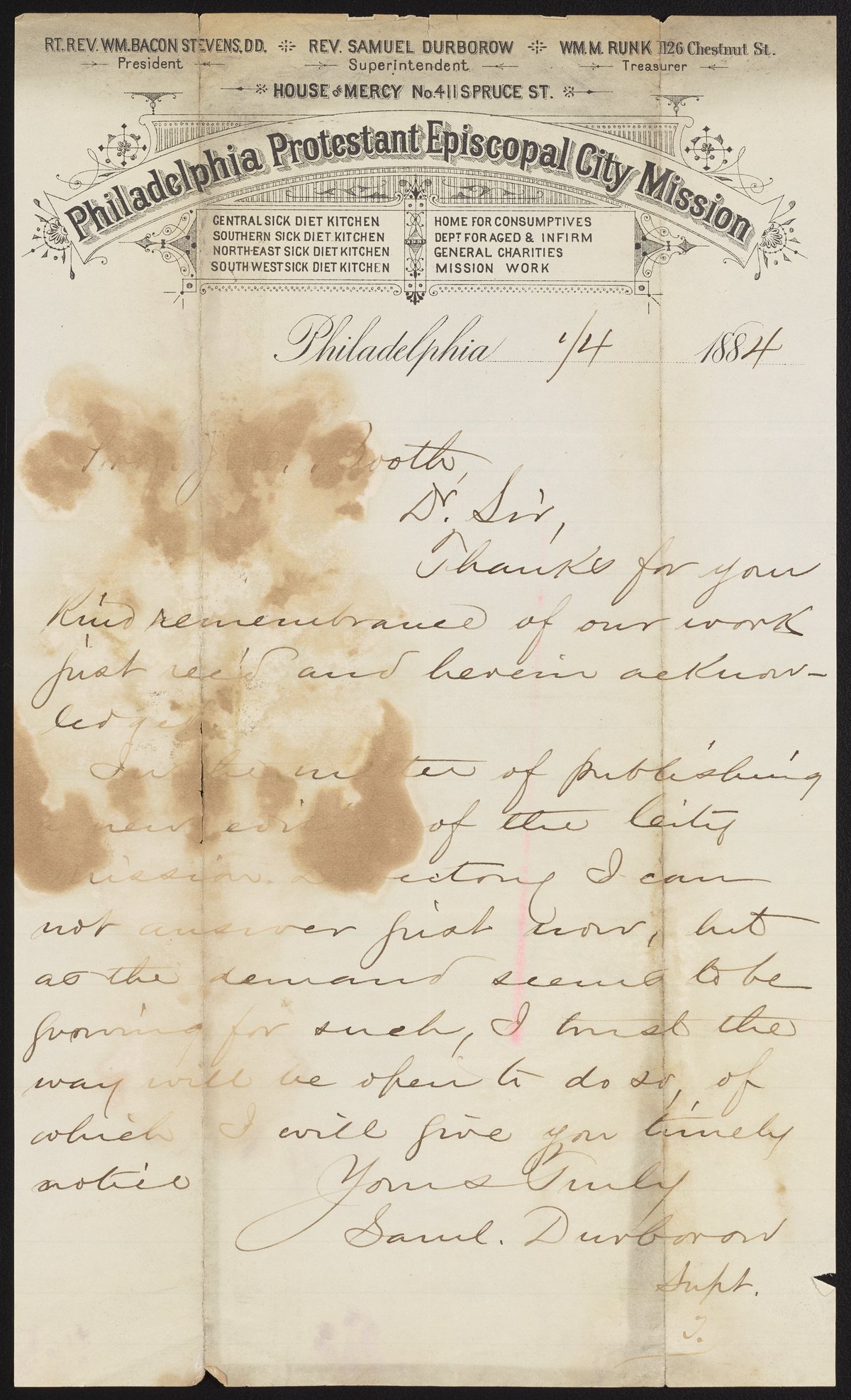 Samuel Durborow, of the Philadelphia Protestant Episcopal City Mission, writes to James Curtis Booth (1810-1888) with thanks for his donation.