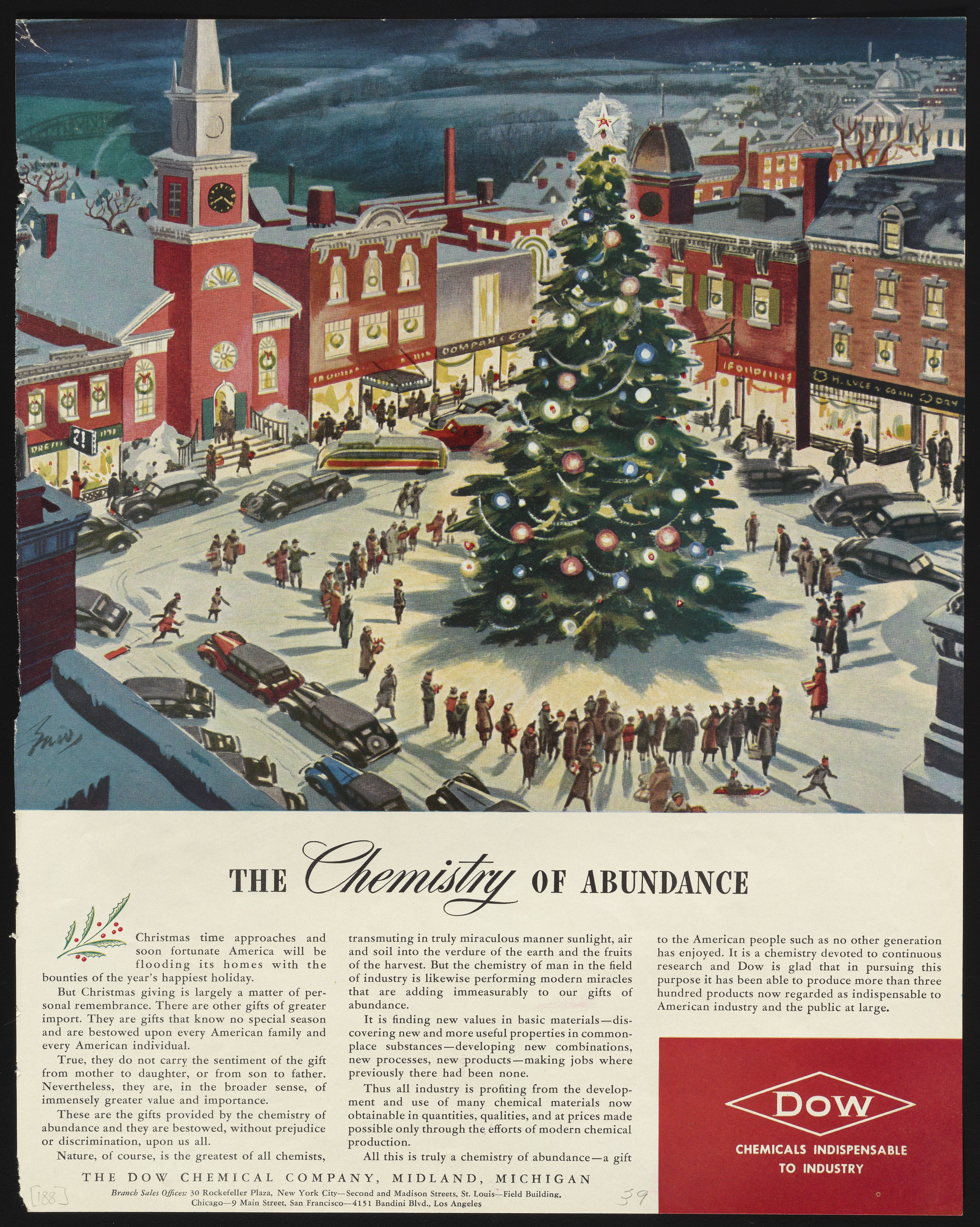 Print advertisement for Dow Chemical Company depicts a holiday scene with a Christmas tree rising from a bustling town square. People surround the tree, as if attending a tree-lighting ceremony. The paragraph below the image describes the meaning behind the title "The Chemistry of Abundance," specifically the jobs and conveniences brought about by the Dow Chemical Company's production of more than three hundred products.