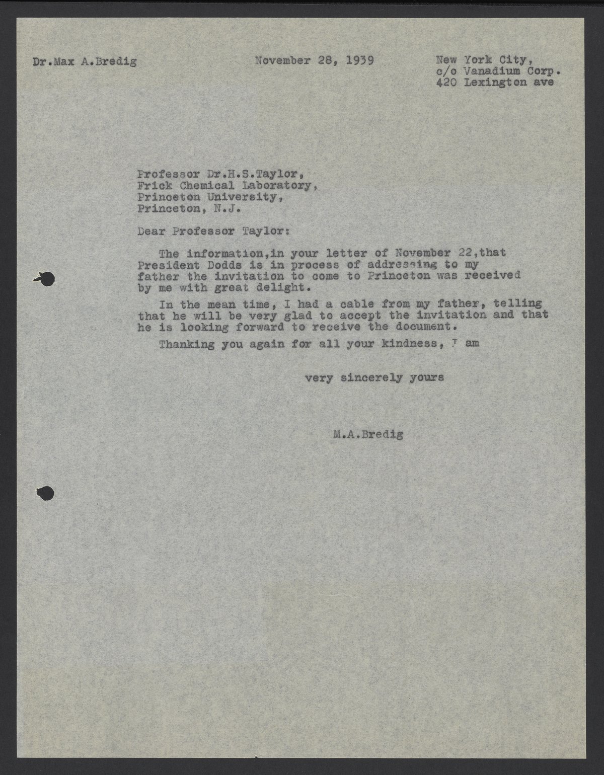 Letter from Max Bredig to Hugh S. Taylor, November 28, 1939
