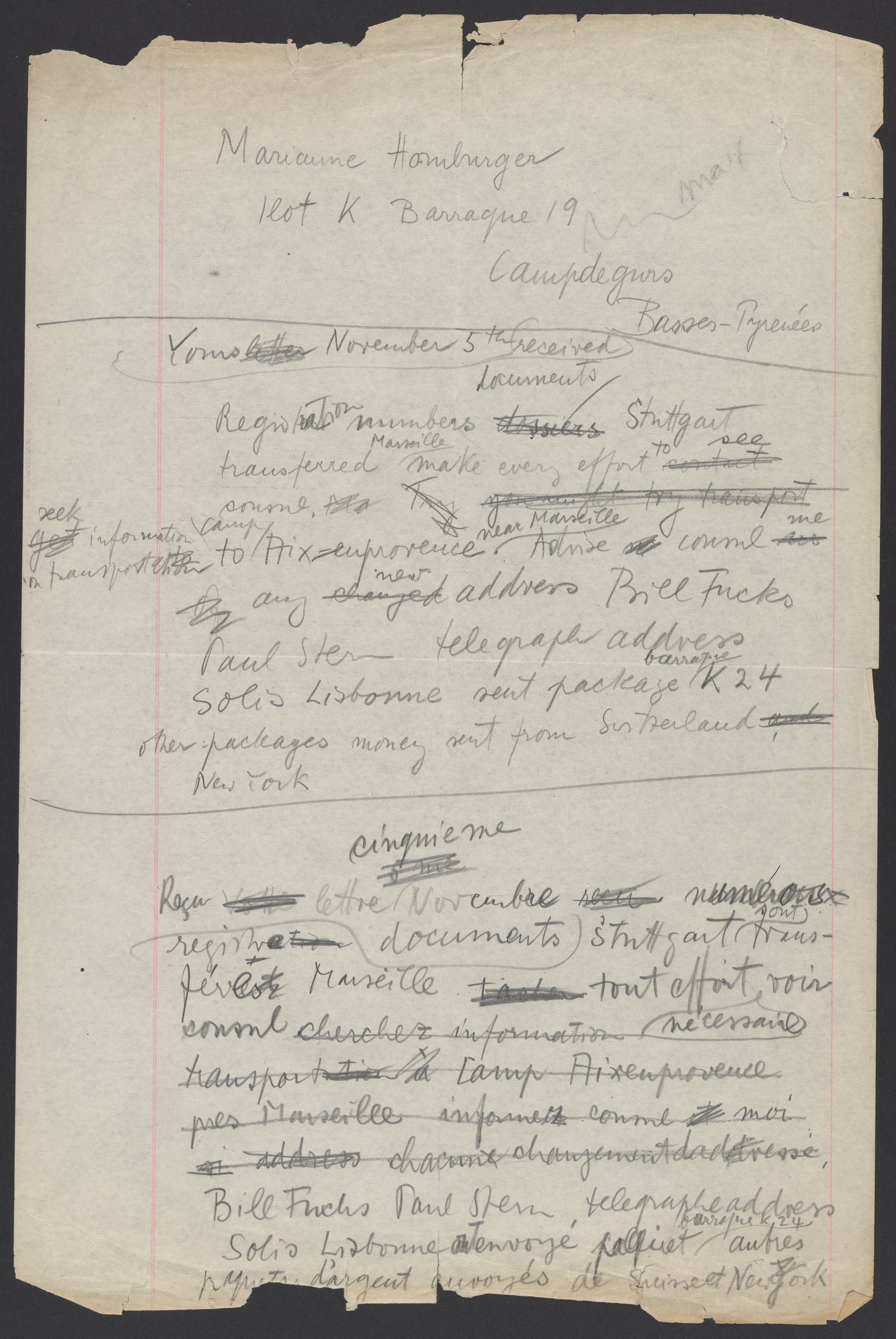 Max Bredig (1902-1977) drafts a telegraph to his sister, Marianne Homburger (1903-1986), who is interned in Gurs, France. Bredig mentions Marianne's immigration, the addresses of their mutual friends, and incoming packages.