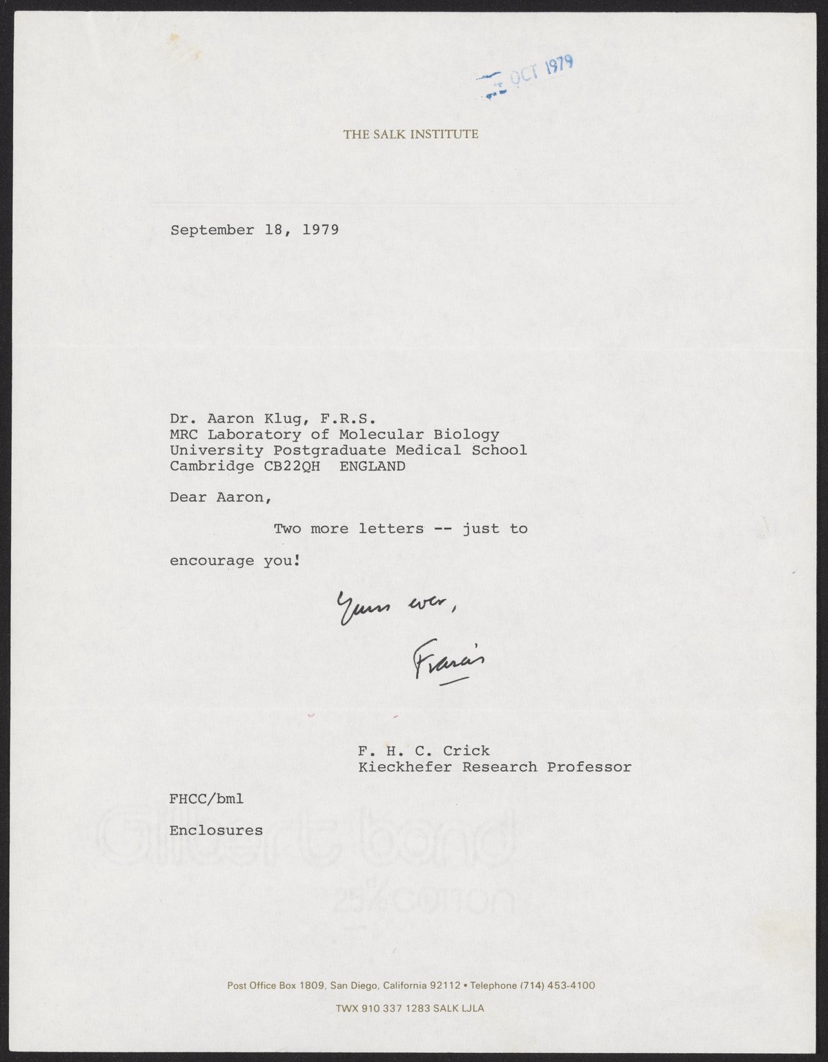 “Letters Forwarded from Francis Crick to Aaron Klug, September 1979,” September 1979. History of Molecular Biology Collection, Box 20, Folder 3. Science History Institute. Philadelphia. https://digital.sciencehistory.org/works/wkwcfnj.