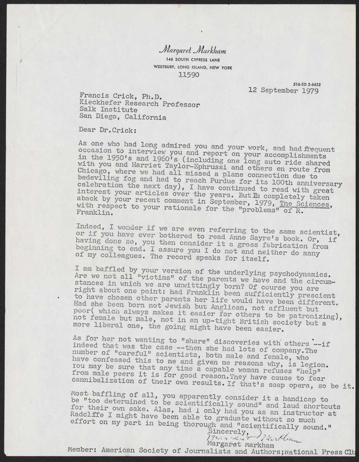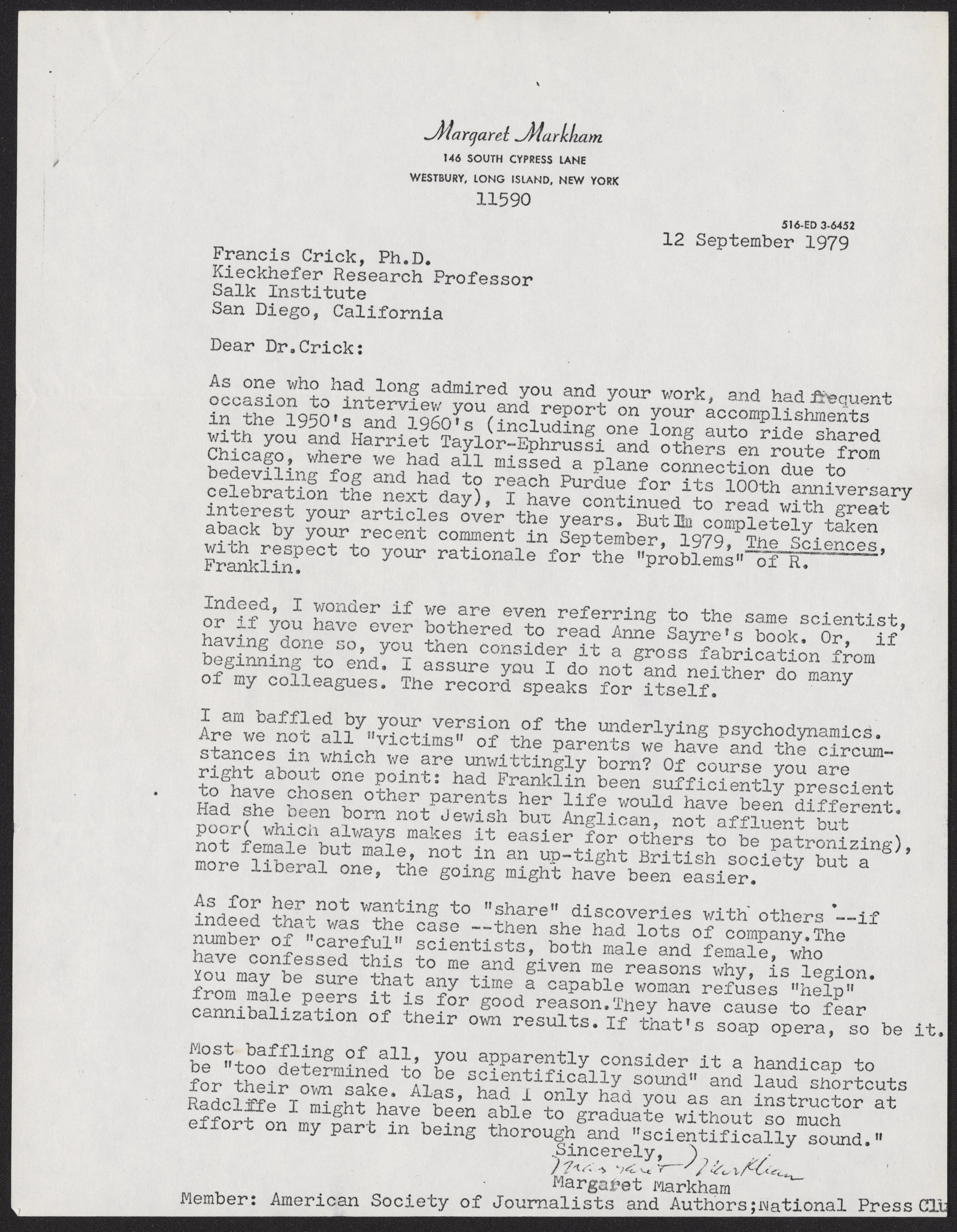 The first, written September 12, 1979, by Margaret Markham to Crick. Markham, a member of the American Society of Journalists and Authors, shares her distaste for how Rosalind Franklin (1920-1958) was portrayed in Crick's article How to Live with a Golden Helix.