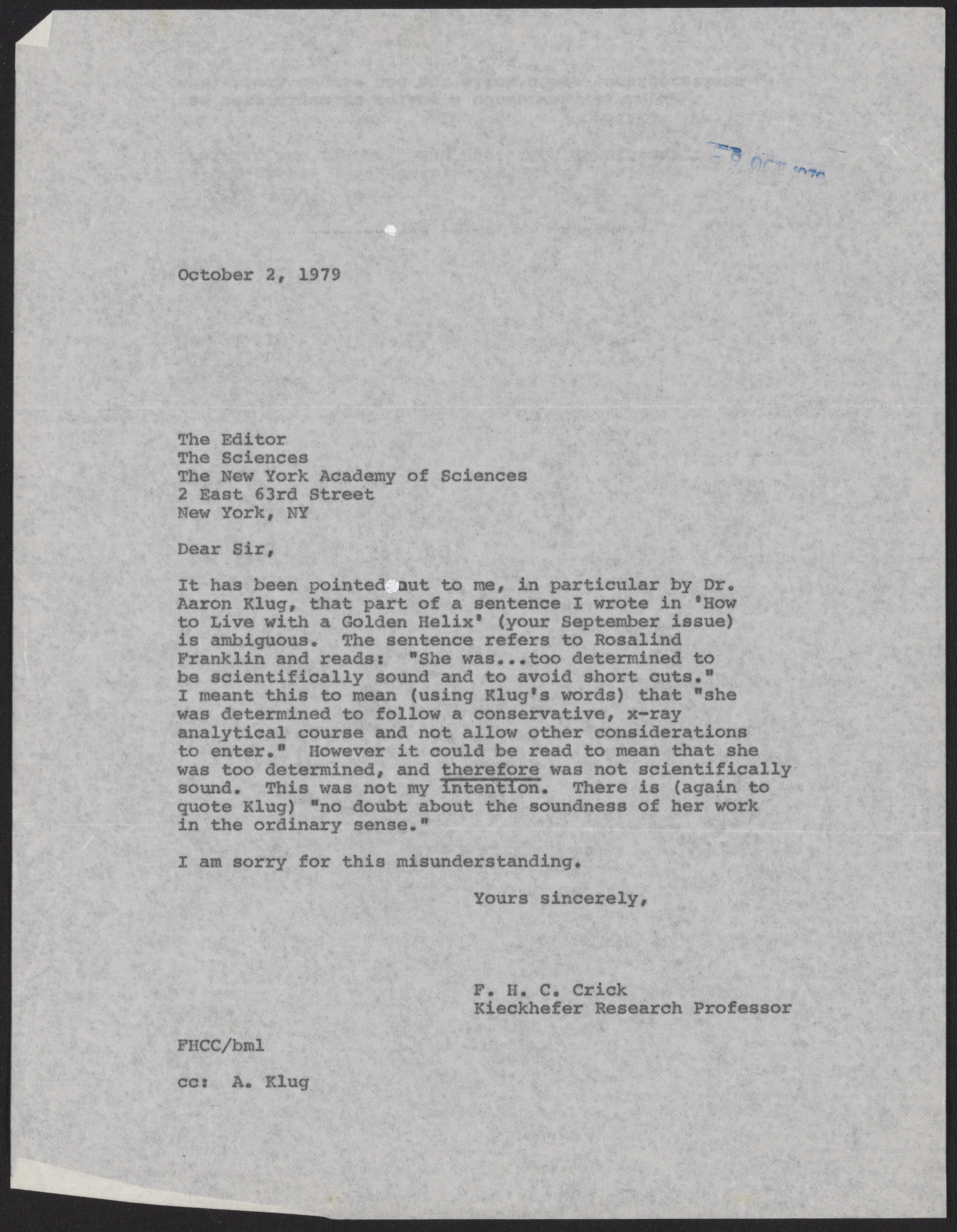 The second letter, written on October 2, 1979, by Francis Crick to the editor of The Sciences. Crick provides clarity to a sentence written in his article and states that he did not intend to imply that Franklin was not scientifically sound.