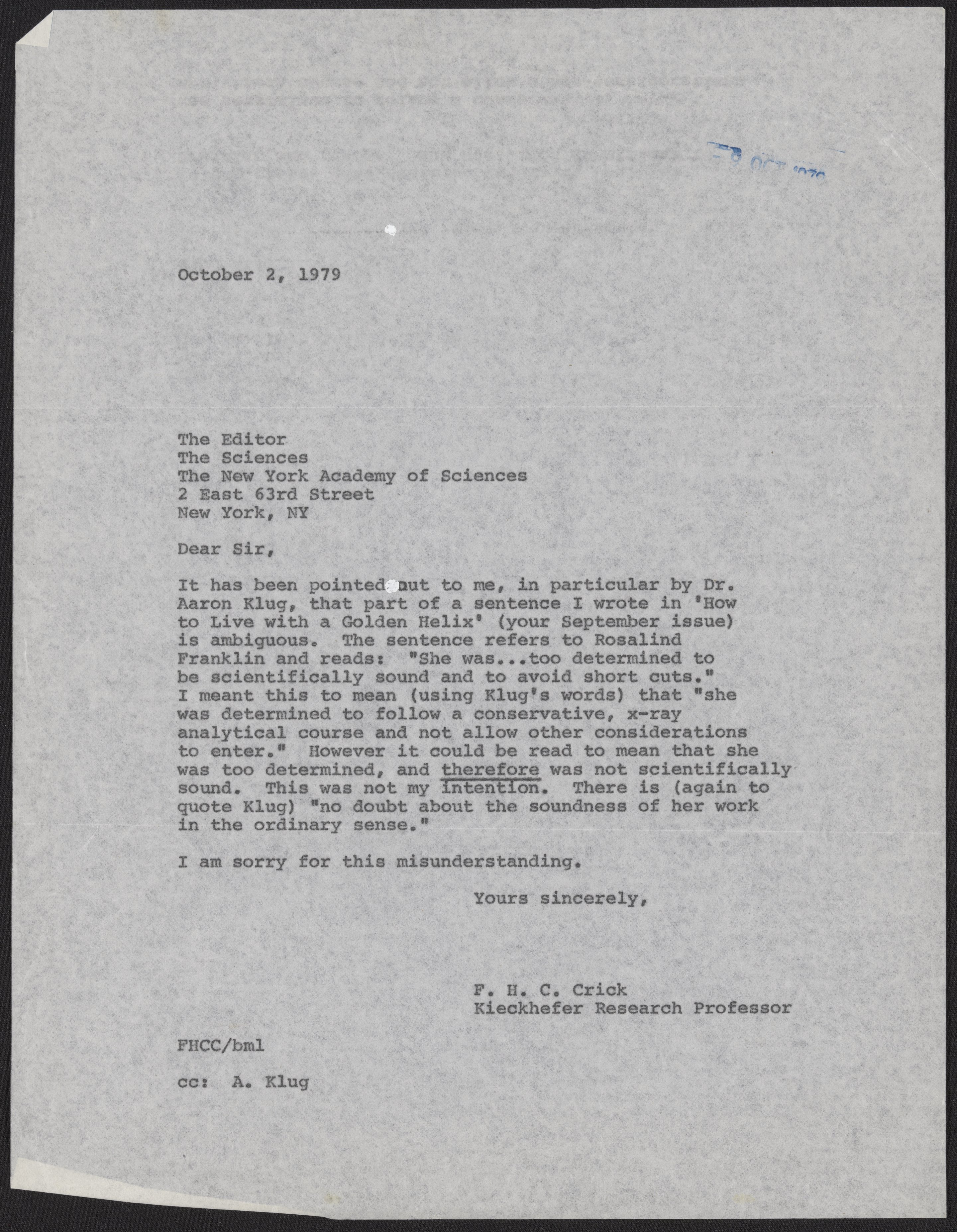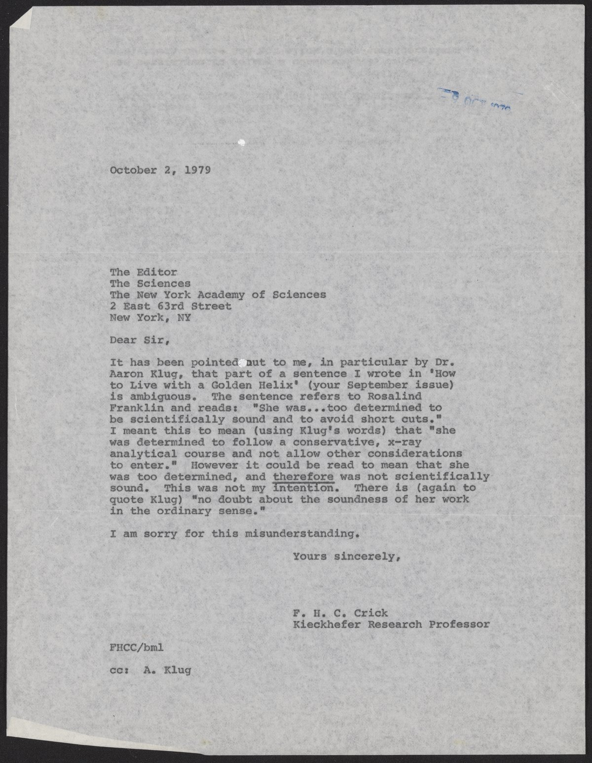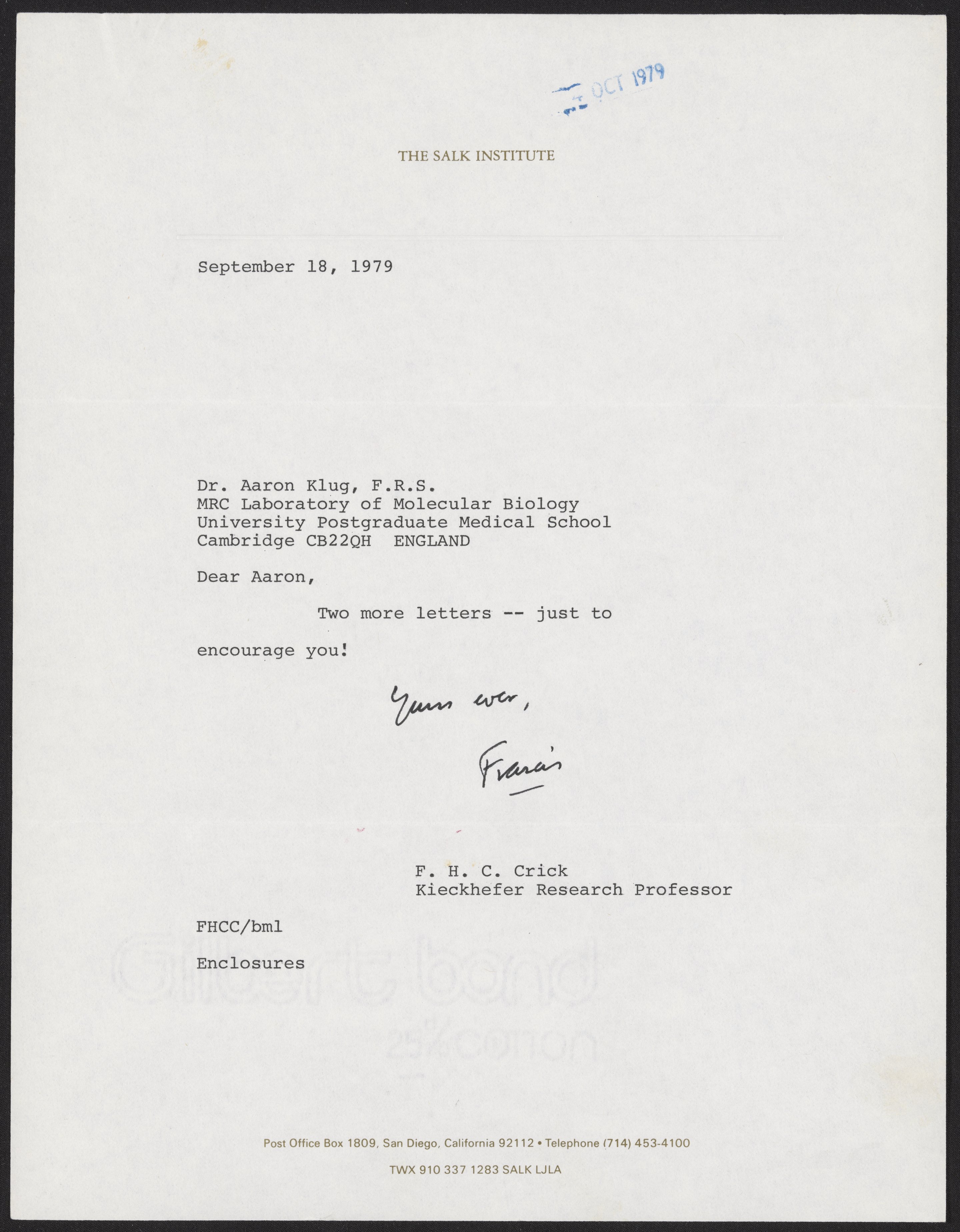 Letters forwarded from Francis Crick to Aaron Klug, September 1979