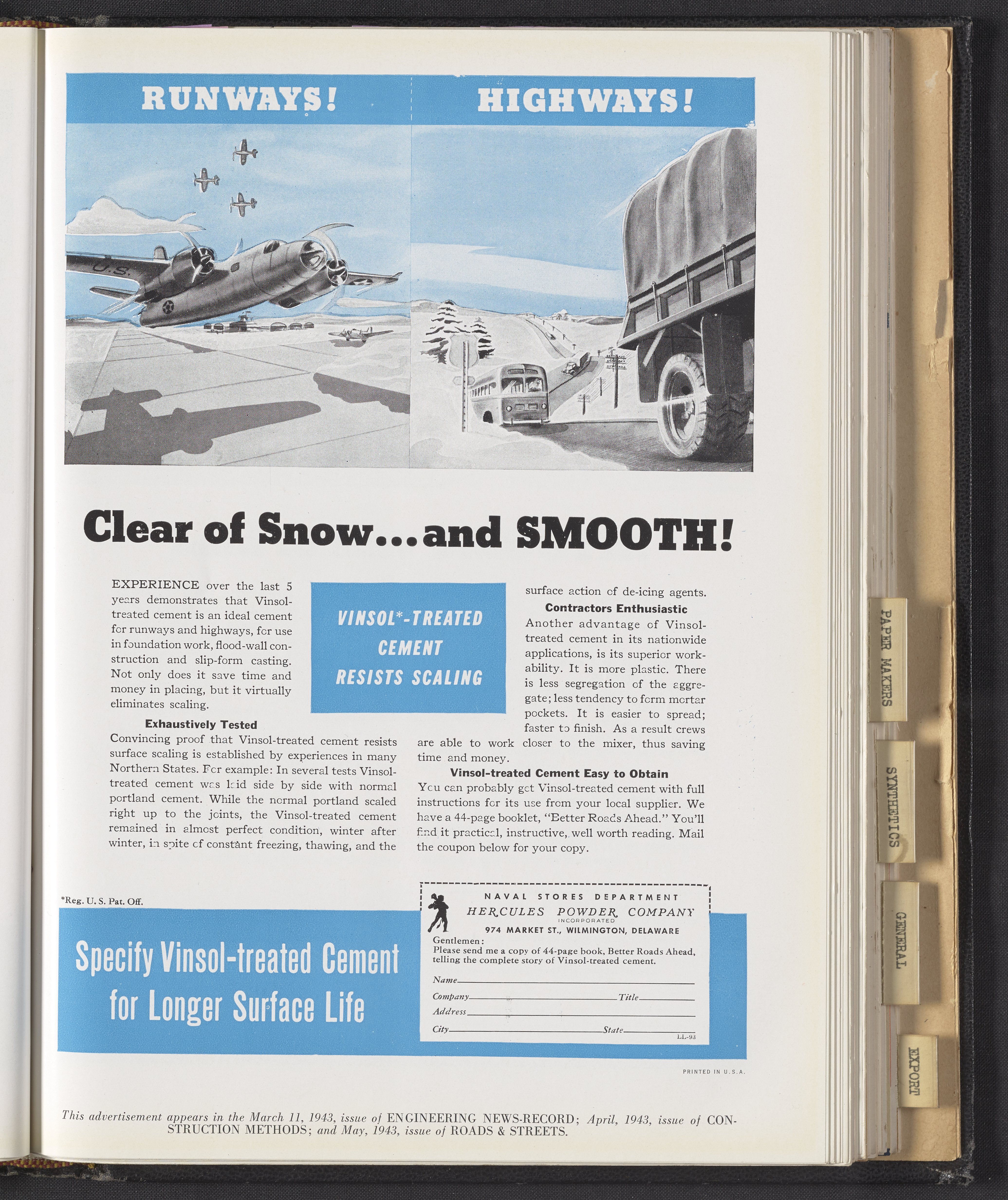 Hercules Incorporated. “Runways! Highways! Clear of Snow...and Smooth!” 1943 Hercules Advertisements, 1943. Records of Hercules Incorporated, Volume 1943. Science History Institute. Philadelphia. https://digital.sciencehistory.org/works/wm117p559.