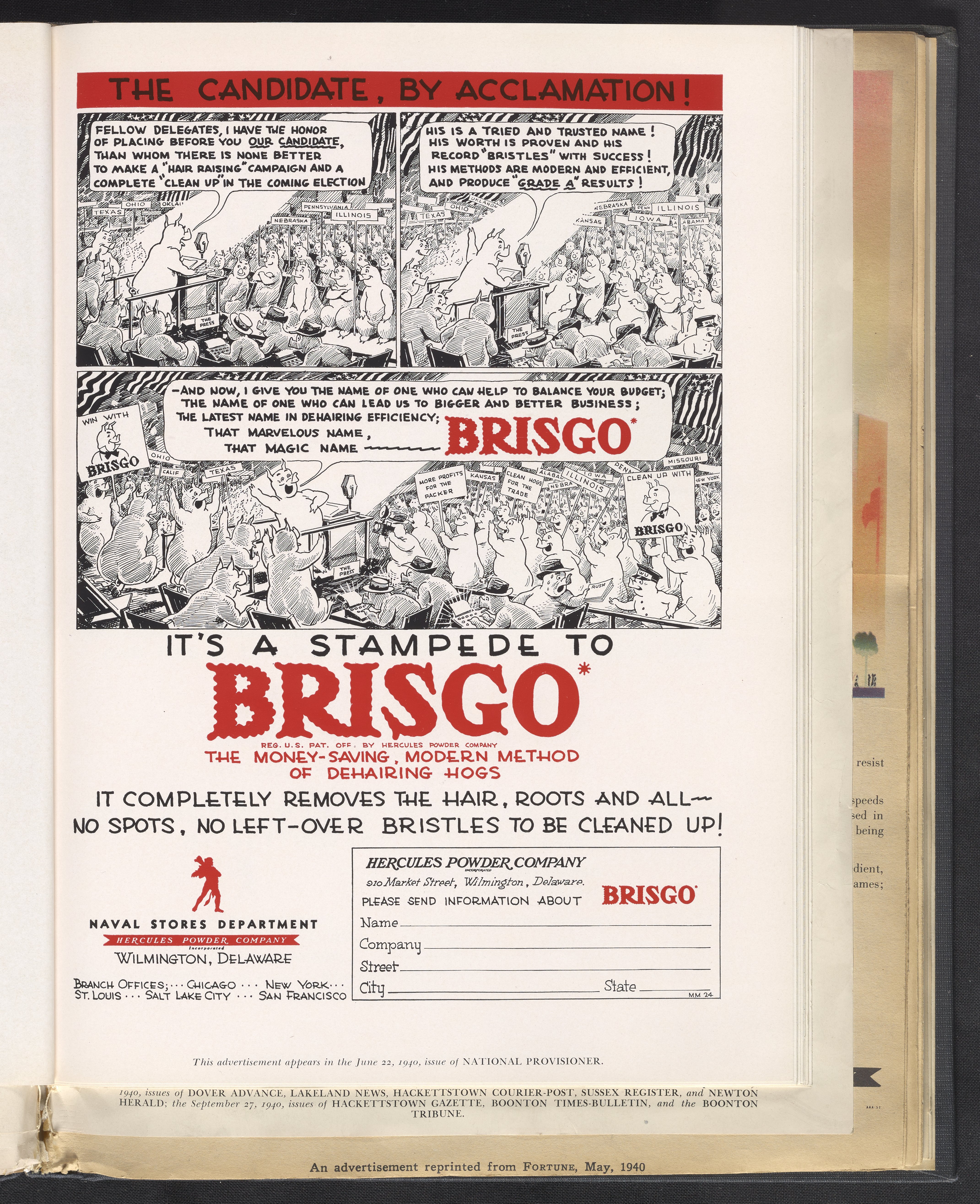 Advertisement for Brisgo, a trademarked depilatory compound manufactured and sold by the Hercules Powder Company for the cosmetic removal of hair from hog skin. The advertisement, published amidst the 1940 U.S. Presidential election, features a cartoon depiction of a hog convention lauding Brisgo as the best candidate to cleanly and efficiently dehair hogs root to tip. This advertisement was published in the June 22, 1940 issue of National Provisioner.