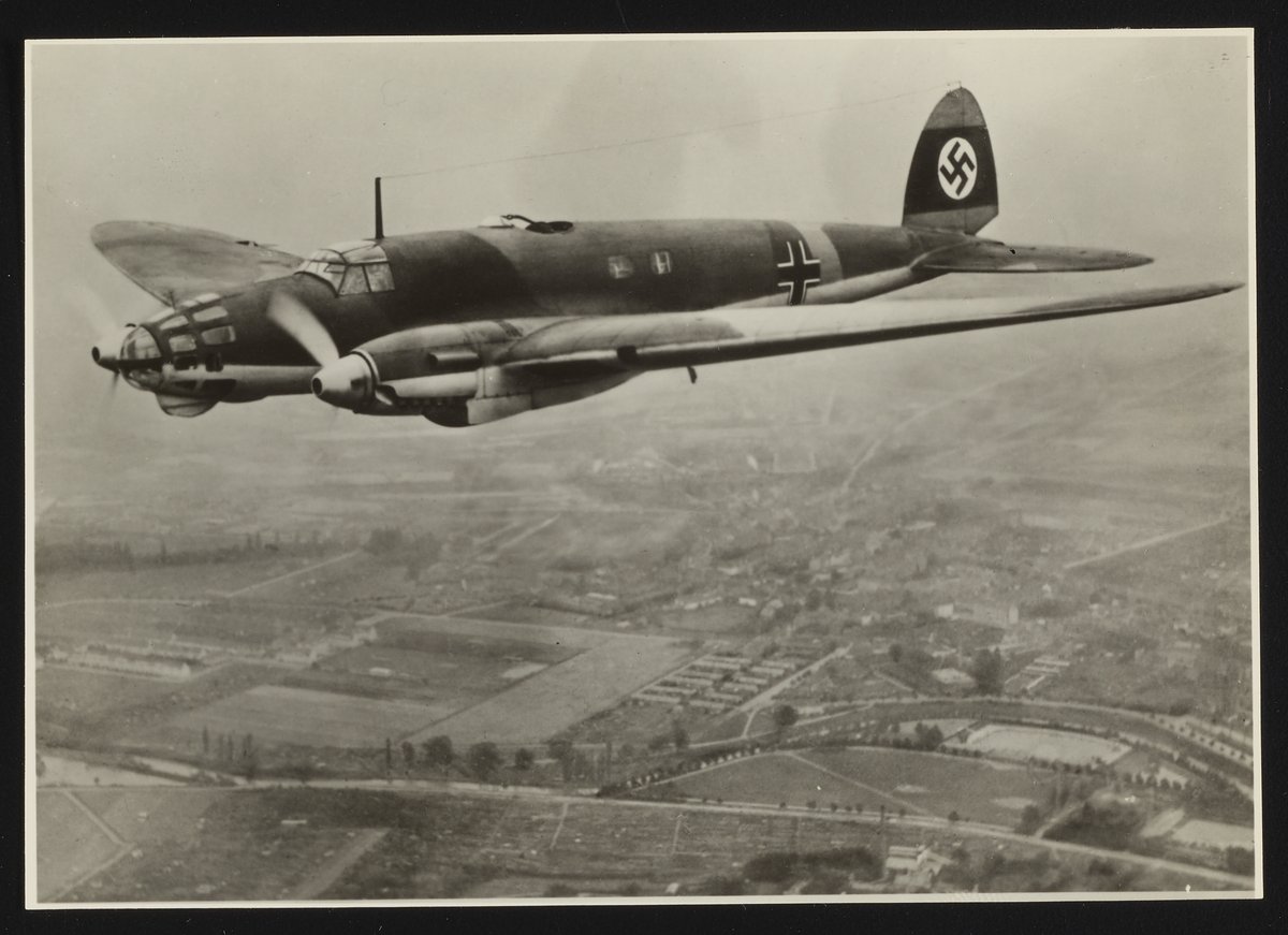 General view of a German aircraft with a Plexiglas windshield and nose panels. Per notations accompanying the photograph, the plane is identified as a Heinkel-Flugzeug HE 111, a type of bomber designed to masquerade as a civilian aircraft due to restrictions placed on German military capabilities following World War I. Notably, a swastika is visible on the tail of the aircraft.