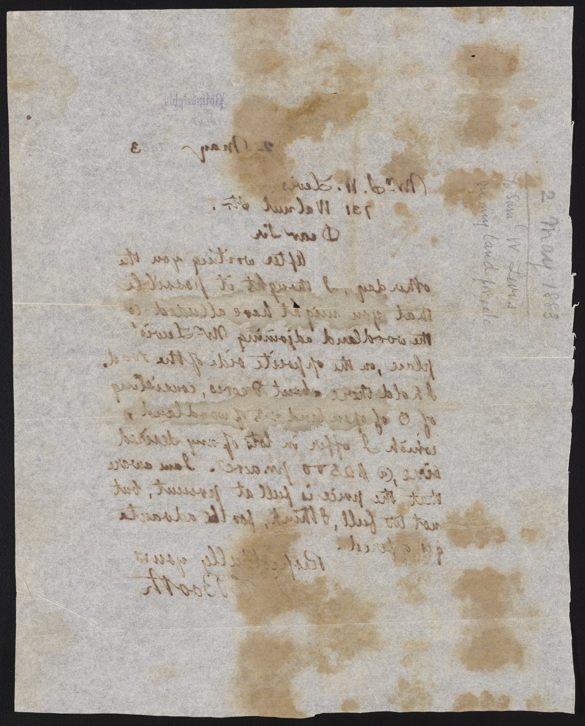 Letter from James Curtis Booth to Samuel W. Levis, May 2, 1883