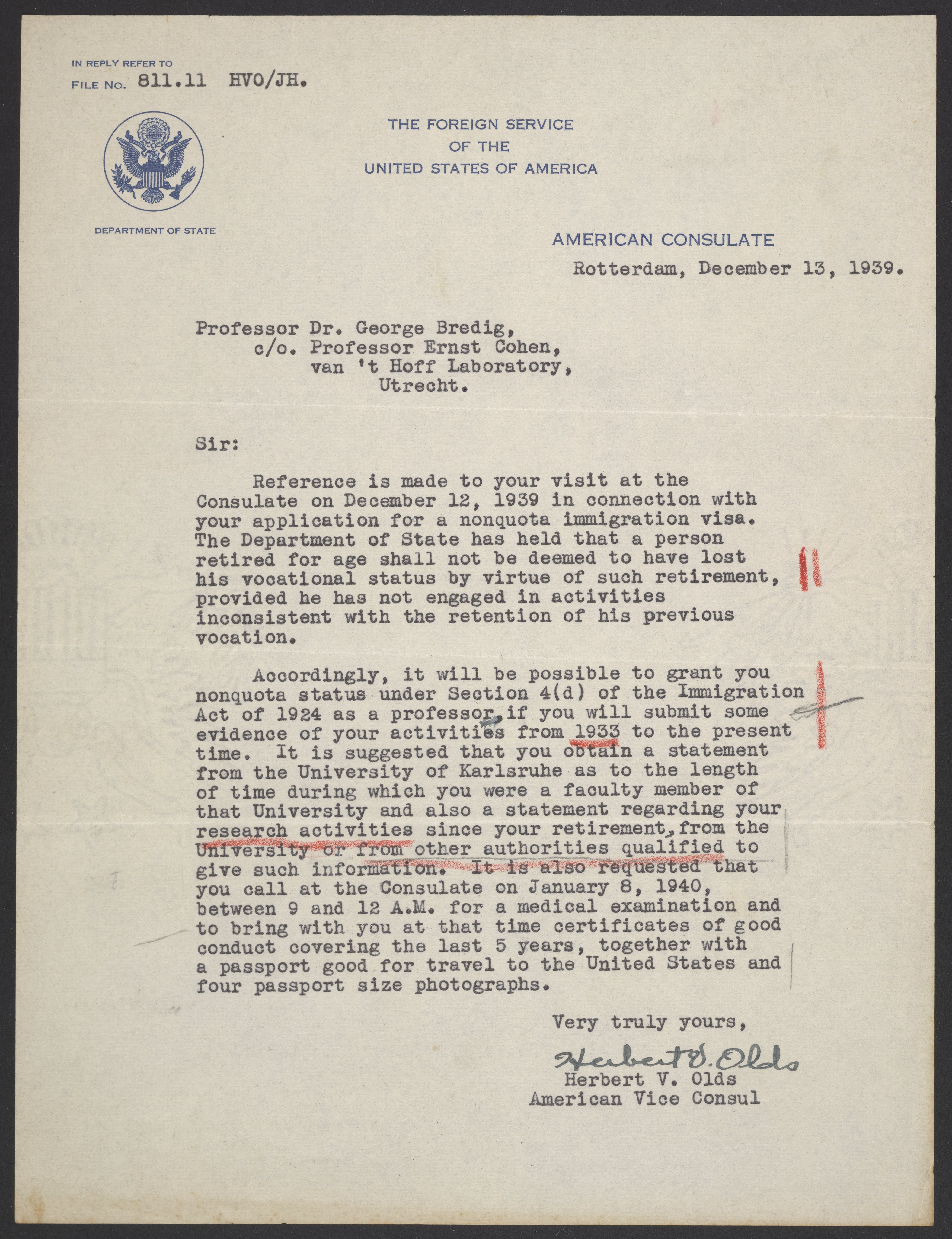 Letter from Herbert V. Olds (1913–1999), the American vice-consulate, informing Georg Bredig (1868-1944) that he will be able to immigrate to the United States if he can provide proof of his scientific activities from 1933 to 1939.