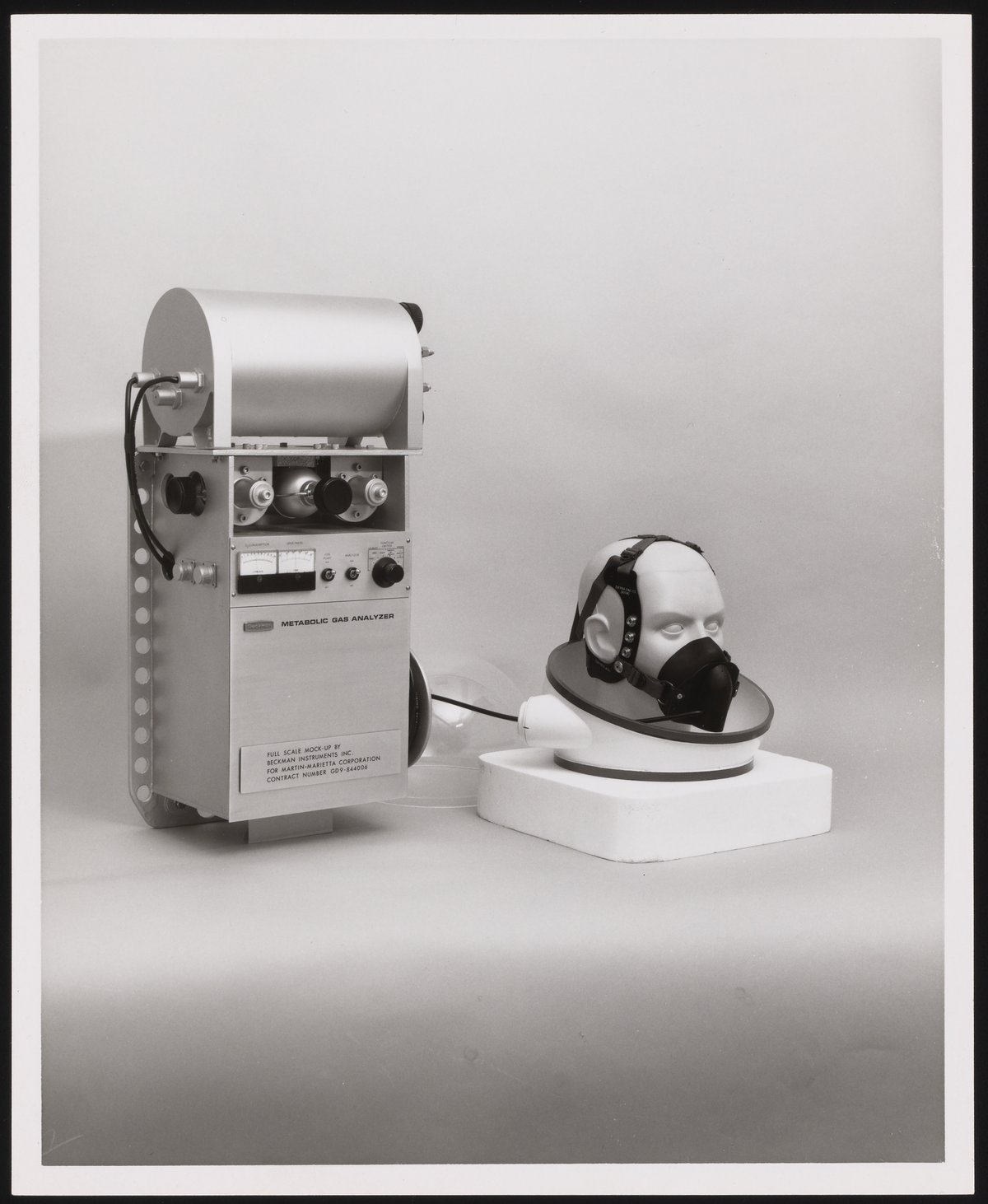 A full-scale model of a gas analysis instrument made by Beckman Instruments' Advanced Technology Operations (ATO) in 1968 for the Martin-Marietta Corporation for potential use on the Skylab space station. This instrument was designed to measure astronauts' capability to perform labor during extended periods of weightlessness.