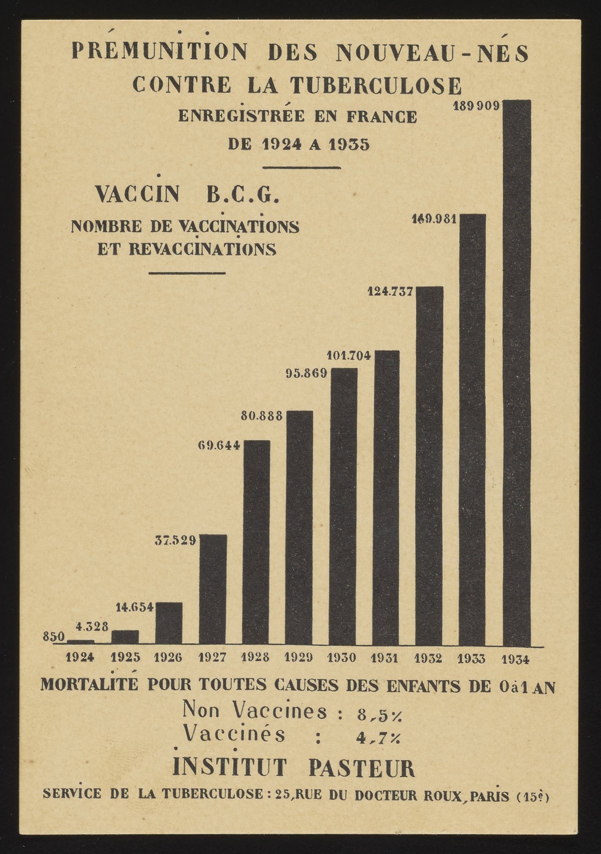 “Postcard - Prémunition Des Nouveau-Nés Contre La Tuberculose Enregistrée En France De 1924 à 1935.” Paris, France: Institut Pasteur (Paris, France), circa 1935. Fisher-Pasteur Memorial Collection, Box 1, Folder 24. Science History Institute. Philadelphia. https://digital.sciencehistory.org/works/wp988j884.