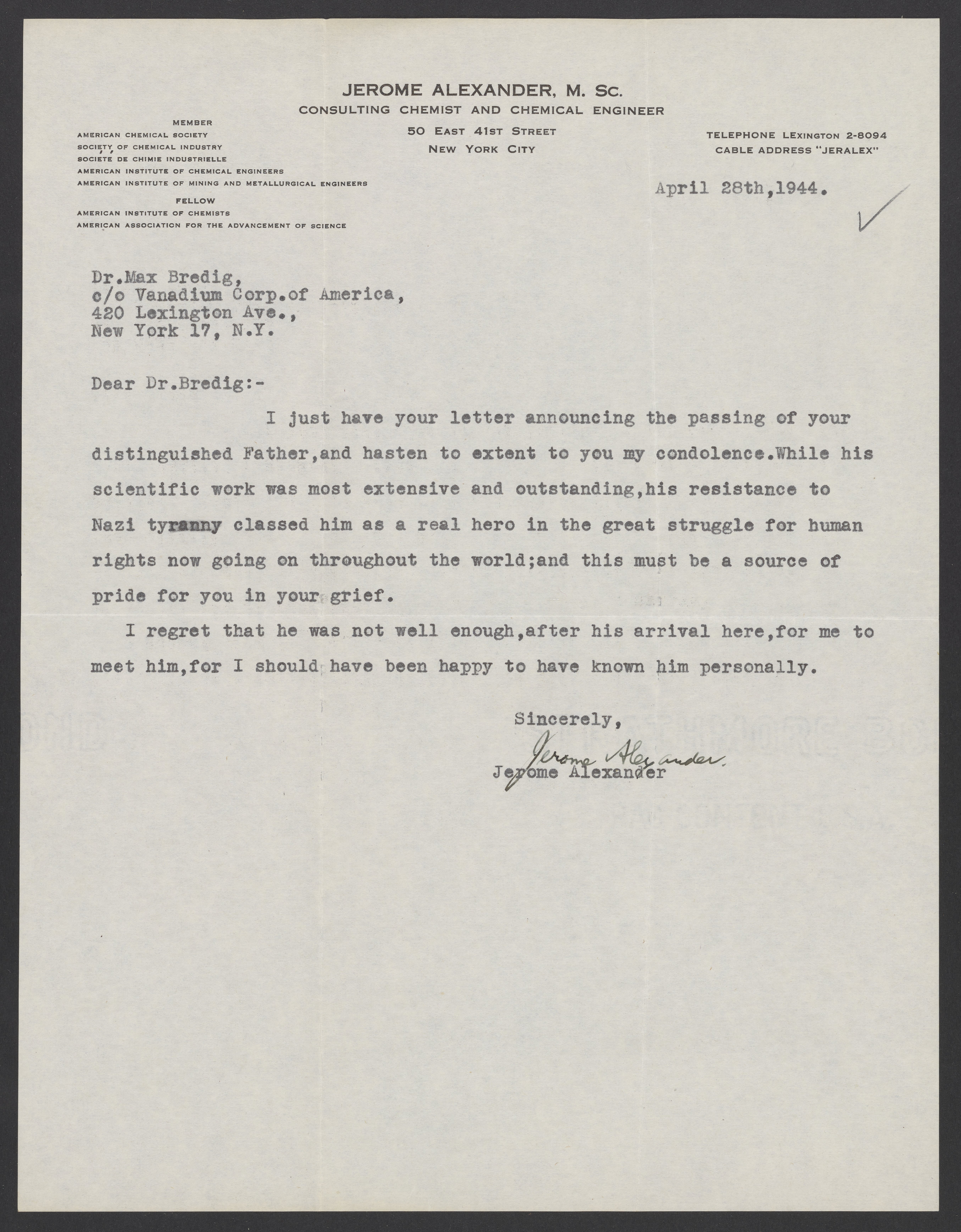 Letter from Jerome Alexander to Max Bredig, April 22, 1944