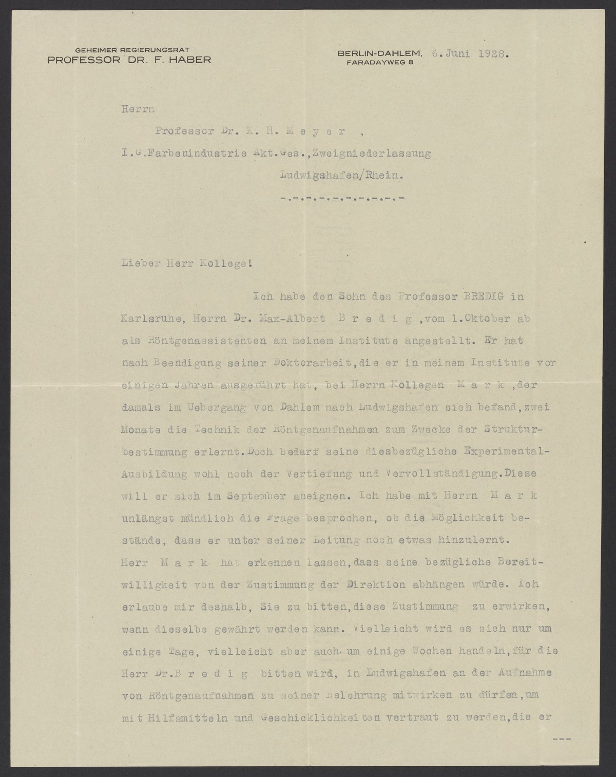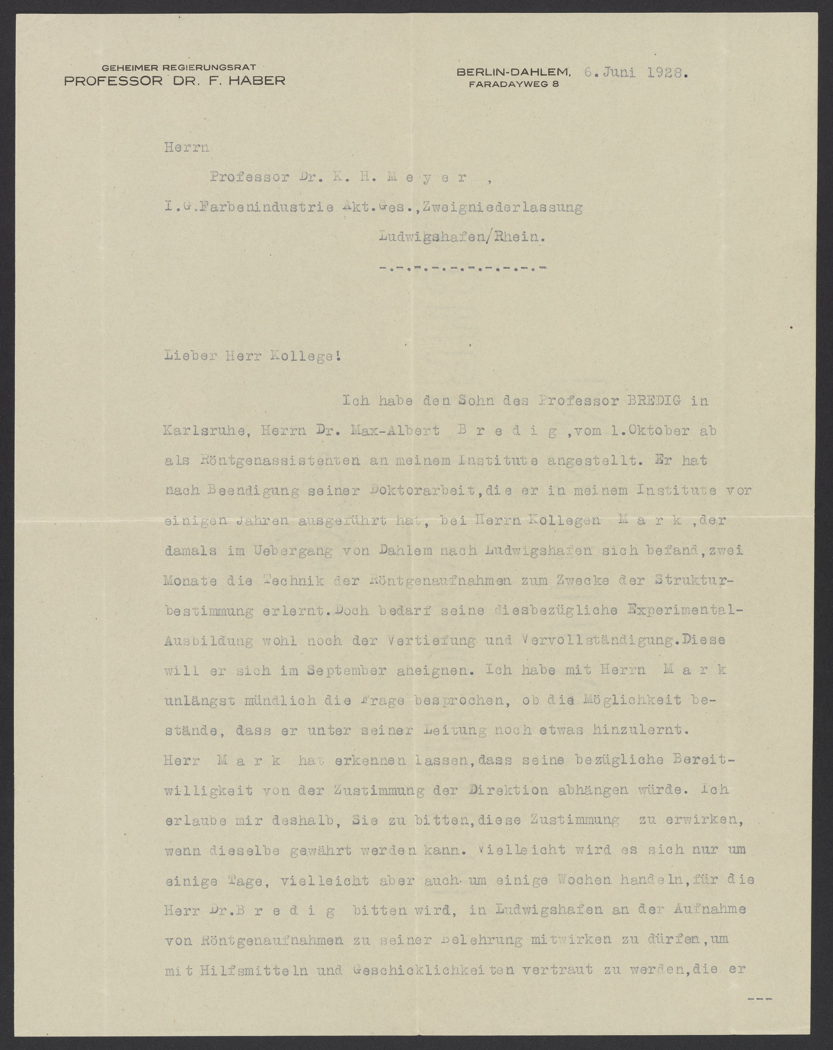 Ich habe den Sohn des Professor BREDIG in Karlsruhe, Herrn Dr. Max-Albert Bredig, vom 1. Oktober ab als Röntgenassistenten an meinem Institute angestellt. Er hat nach Beendigung seiner Doktorarbeit, die er in meinem Institute vor einigen Jahren ausgeführt hat, bei Herrn Kollegen Mark, der damals im Übergang von Dahlem nach Ludwigshafen sich befand, zwei Monate die Technik der Röntgenaufnahmen zum Zwecke der Strukturbestimmung erlernt. Doch bedarf seine diesbezügliche Experimental-Ausbildung wohl noch der Vertiefung und Vervollständigung. Diese will er sich im September aneignen. Ich habe mit Herrn Mark unlängst mündlich die Frage besprochen, ob die Möglichkeit bestände, dass er unter seiner Leitung noch etwas hinzulernt. Herr Mark hat erkennen lassen, dass seine bezügliche Bereitwilligkeit von der Zustimmung der Direktion abhängen würde. Ich erlaube mir deshalb, Sie zu bitten, diese Zustimmung zu erwirken, wenn dieselbe gewährt werden kann. Vielleicht wird es sich nur um einige Tage, vielleicht aber such um einige Wochen handeln, für die Herr Dr. Bredig bitten wird, in Ludwigshafen an der Aufnahme von Röntgenaufnahmen zu seiner Belehrung mitwirken zu dürfen, um mit Hilfsmitteln und Geschicklichkeit vertraut zu werden, die er