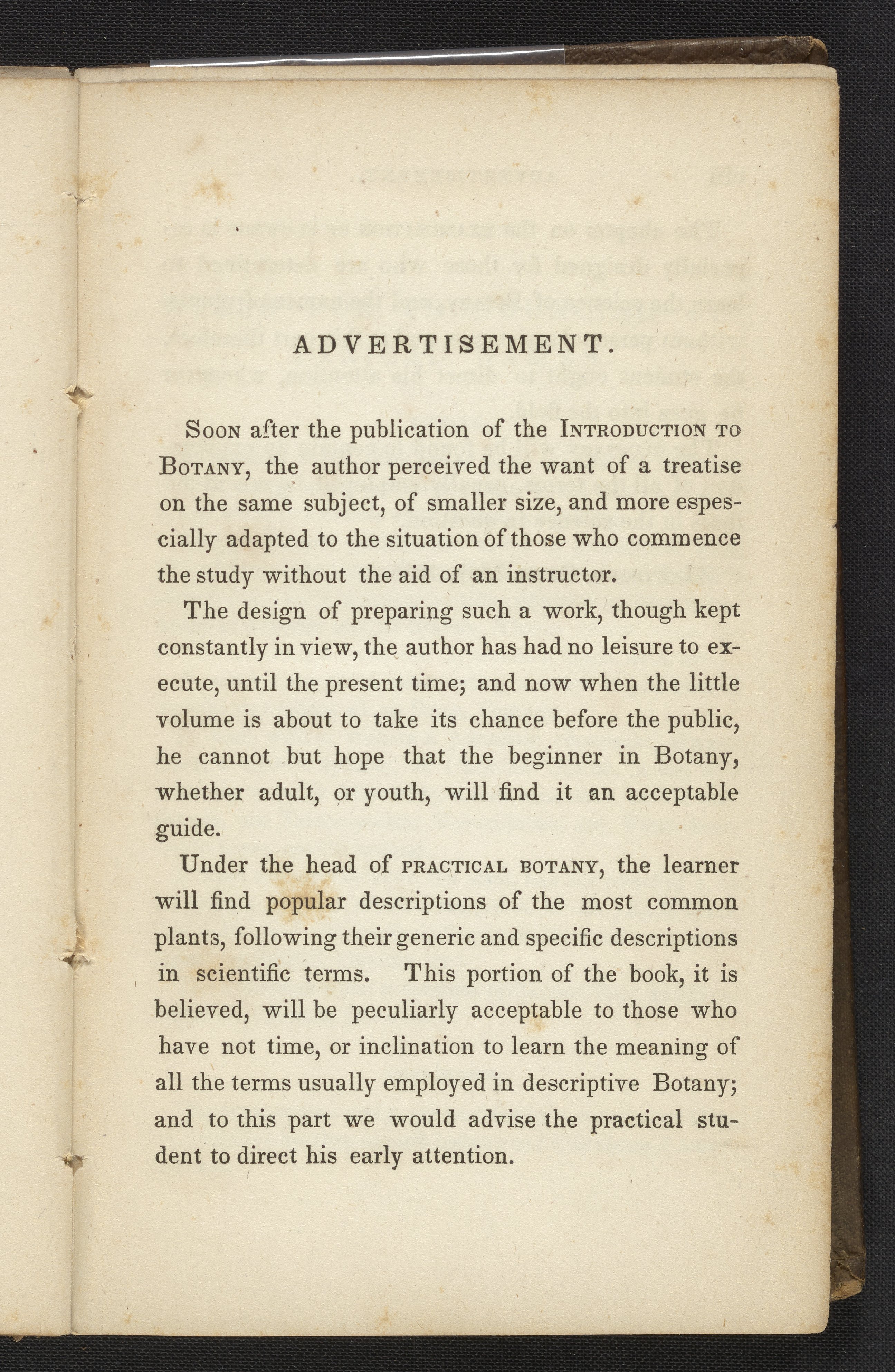 The cover and frontismatter have been digitized from this work that serves as an introduction to botany. Digitized table of contents lists an introduction to plants along with various plants and classes of plants. Includes a glossary of botanical terms at the end of the book.