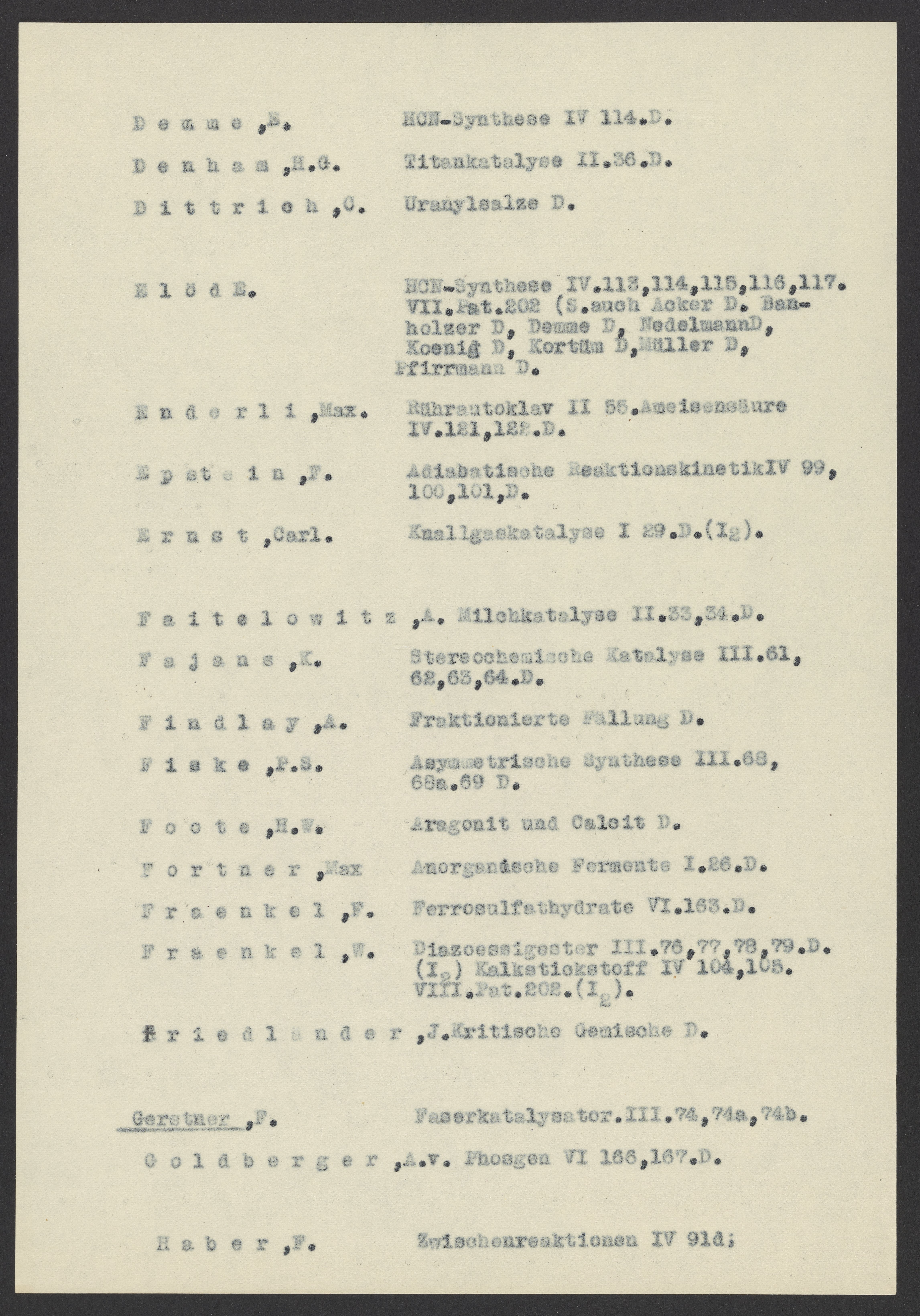 Includes a table of contents and an alphabetical list of Georg Bredig's (1868-1944) employees.