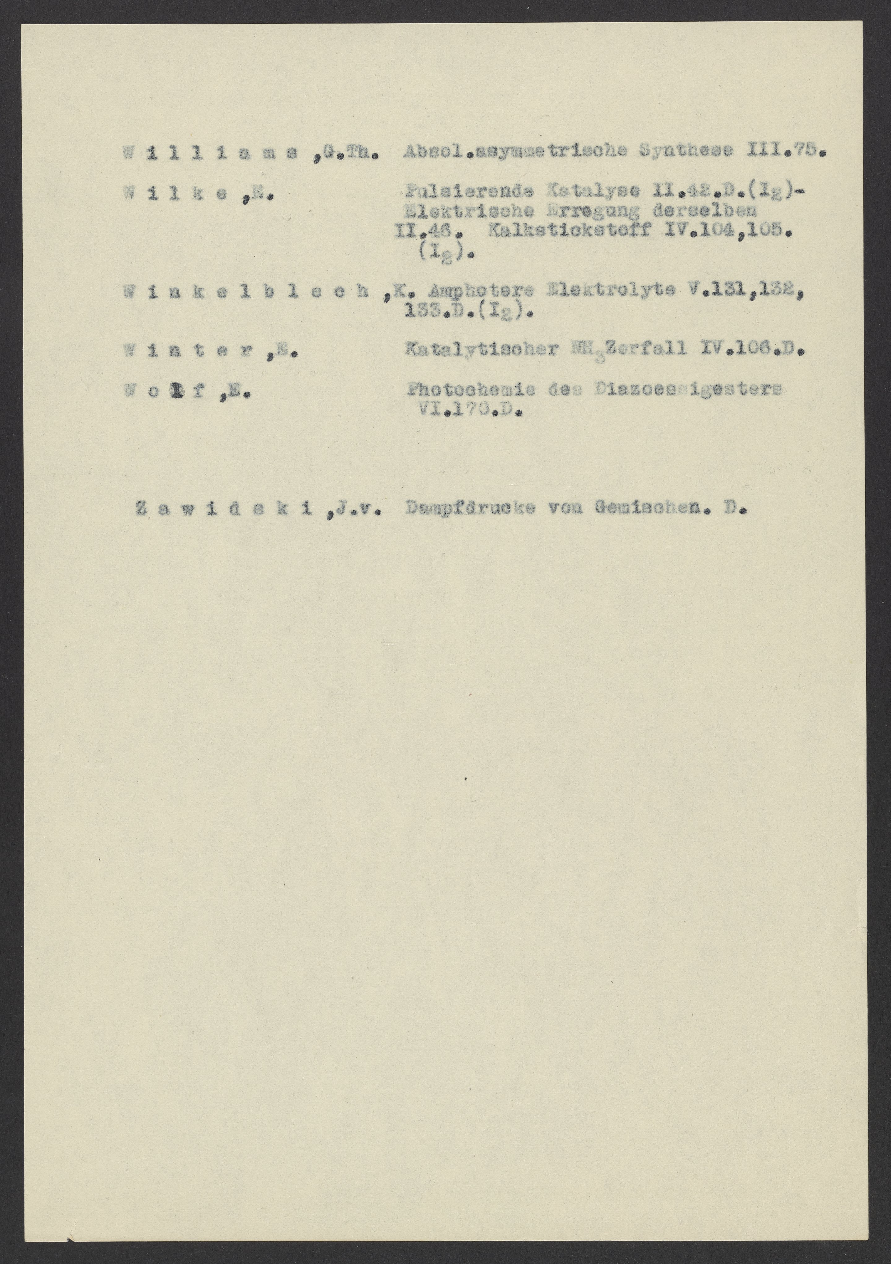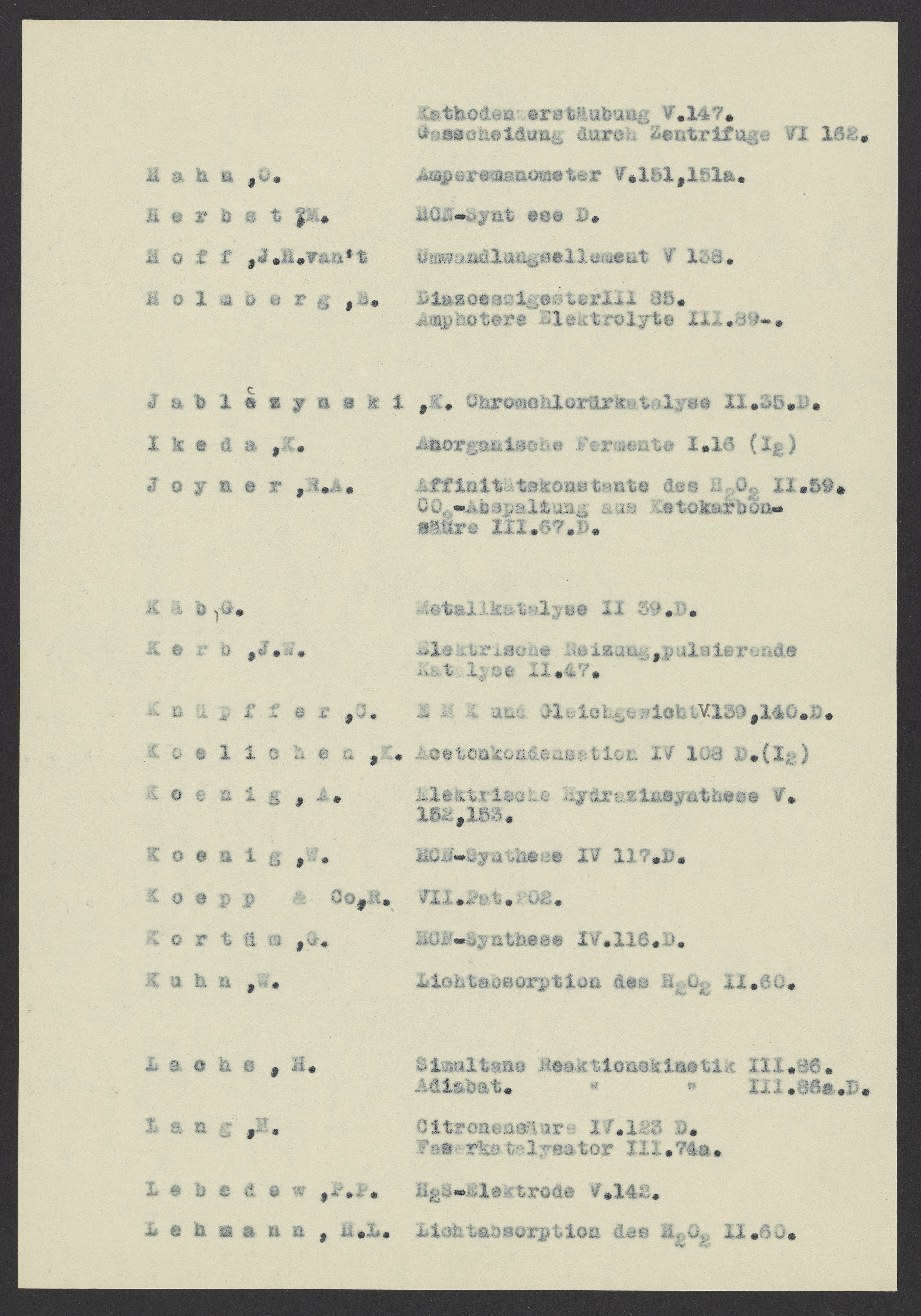 Includes a table of contents and an alphabetical list of Georg Bredig's (1868-1944) employees.