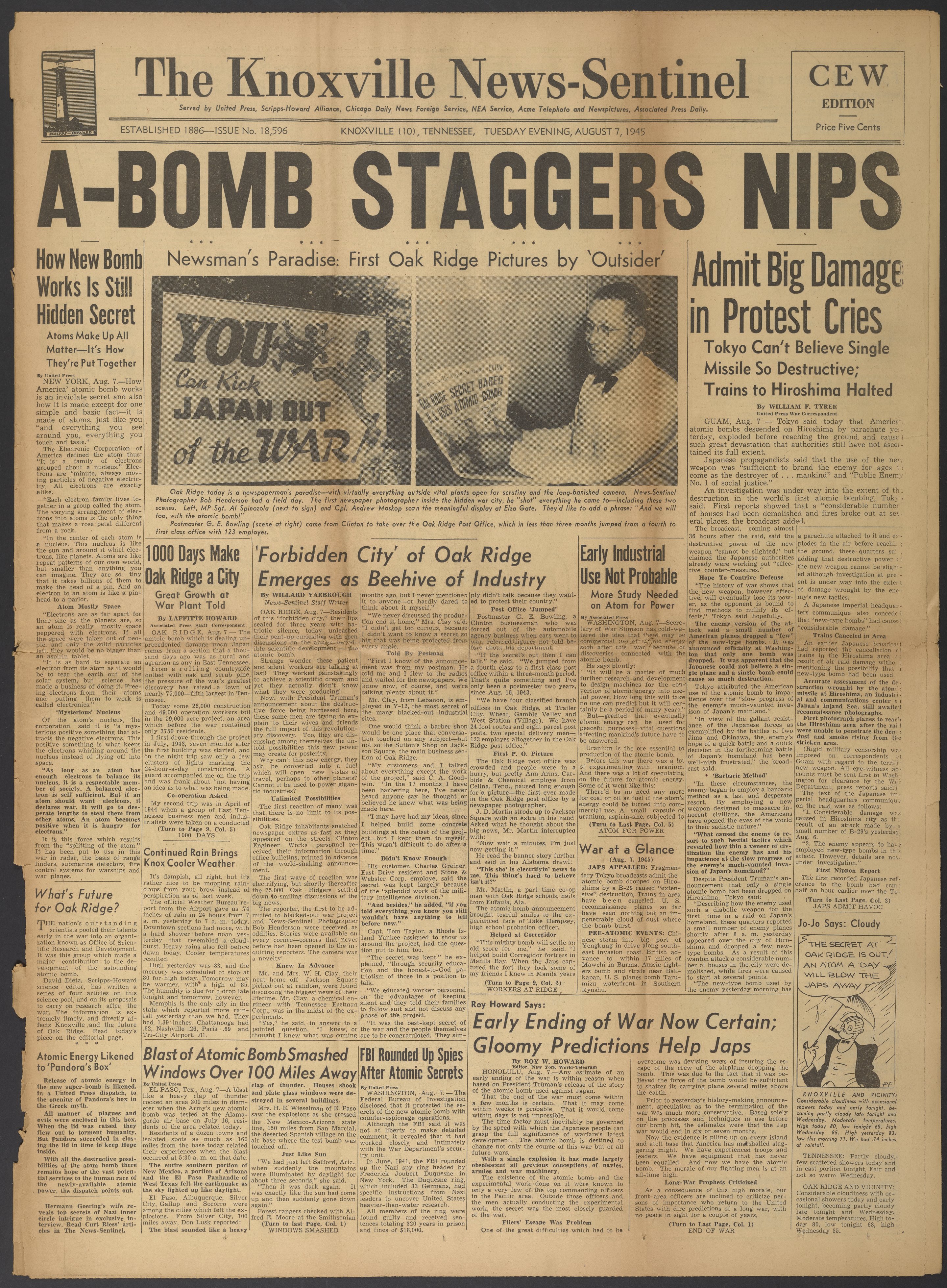 Front page of the August 7, 1945 issue of The Knoxville News-Sentinel with the headline "A-Bomb Staggers Nips." The page has articles relating to the Oak Ridge Laboratory and the dropping of the atomic bomb on Japan. Notably, racist ethnic slurs are used to refer to the Japanese in the headline and featured articles. The use of these words reflects the heightened anti-Japanese sentiments that were fueled by World War II.
