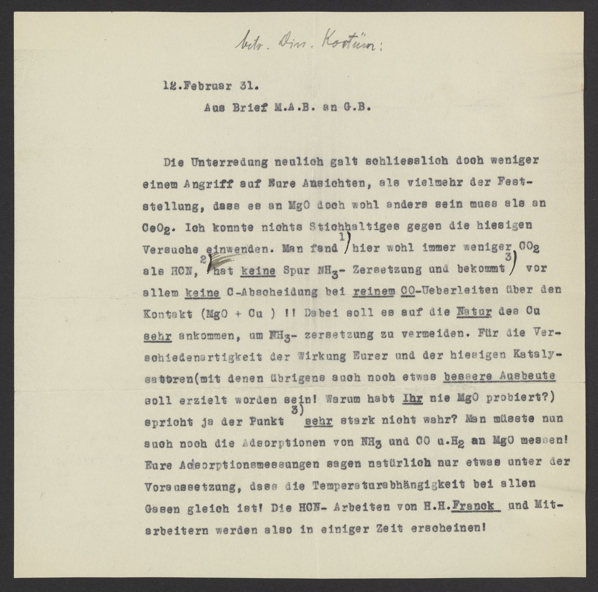 Excerpt from a letter from Max Bredig to Georg Bredig, February 12, 1931