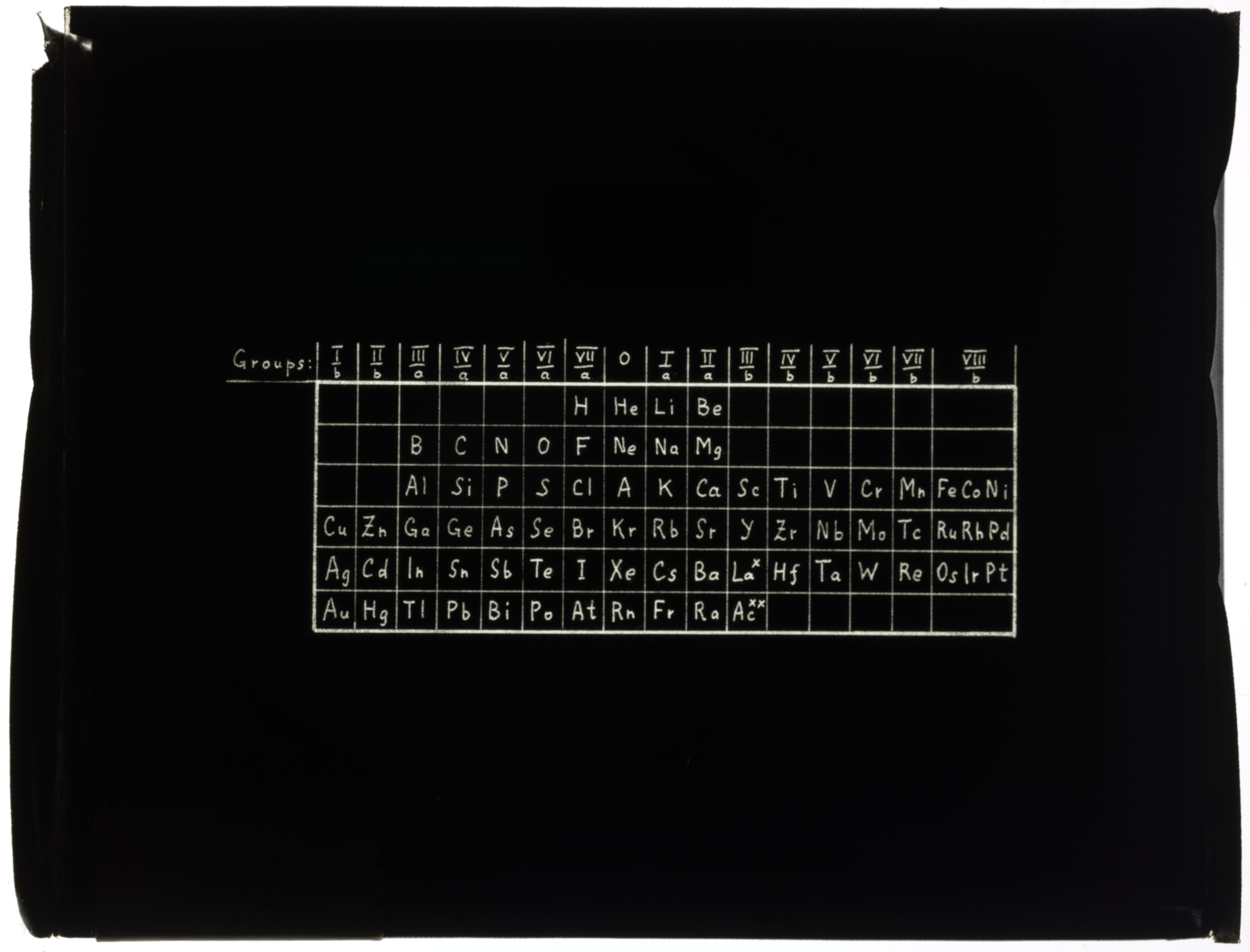 Horsley, George, and Edward G. Mazurs. “Series Table in Which Each Series Begins with Group Ib.” Glass (material), circa 1900–1957. Edward G. Mazurs Collection of Periodic Systems Images, Box 1. Science History Institute. Philadelphia. https://digital.sciencehistory.org/works/ww72bc06b.