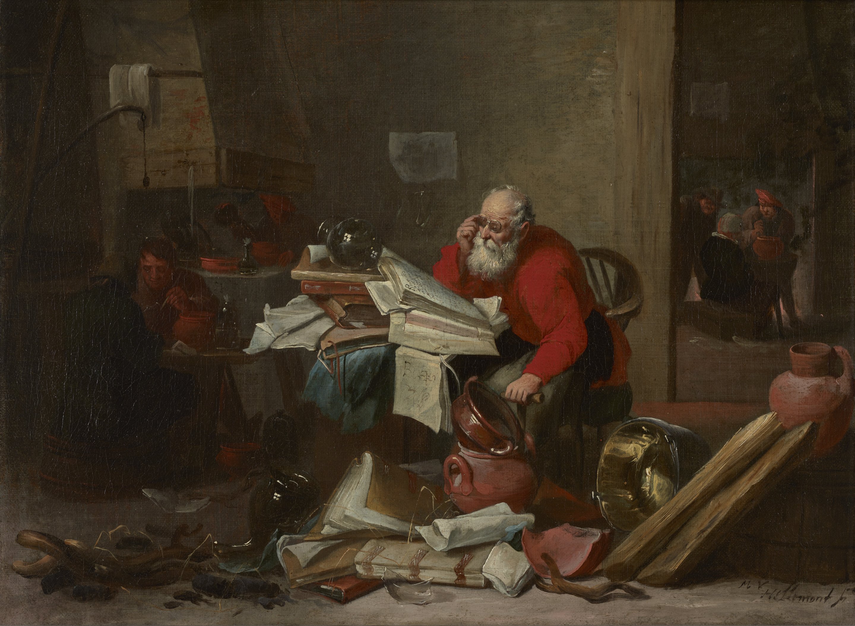 A bearded, seated alchemist, wearing glasses and bright red shirt, bends over an open book on a desk stacked high with a mess of papers and glassware. The trail of books continues to the ground with broken and unbroken crockery, a large copper pan, firewood, and loose strands of straw. At the left middle ground two men work at a table, while behind them a man stands by a large furnace and pours the contents from one vessel into another. Further back, three workshop assistants stand near a small furnace, watching a pot as it heats.