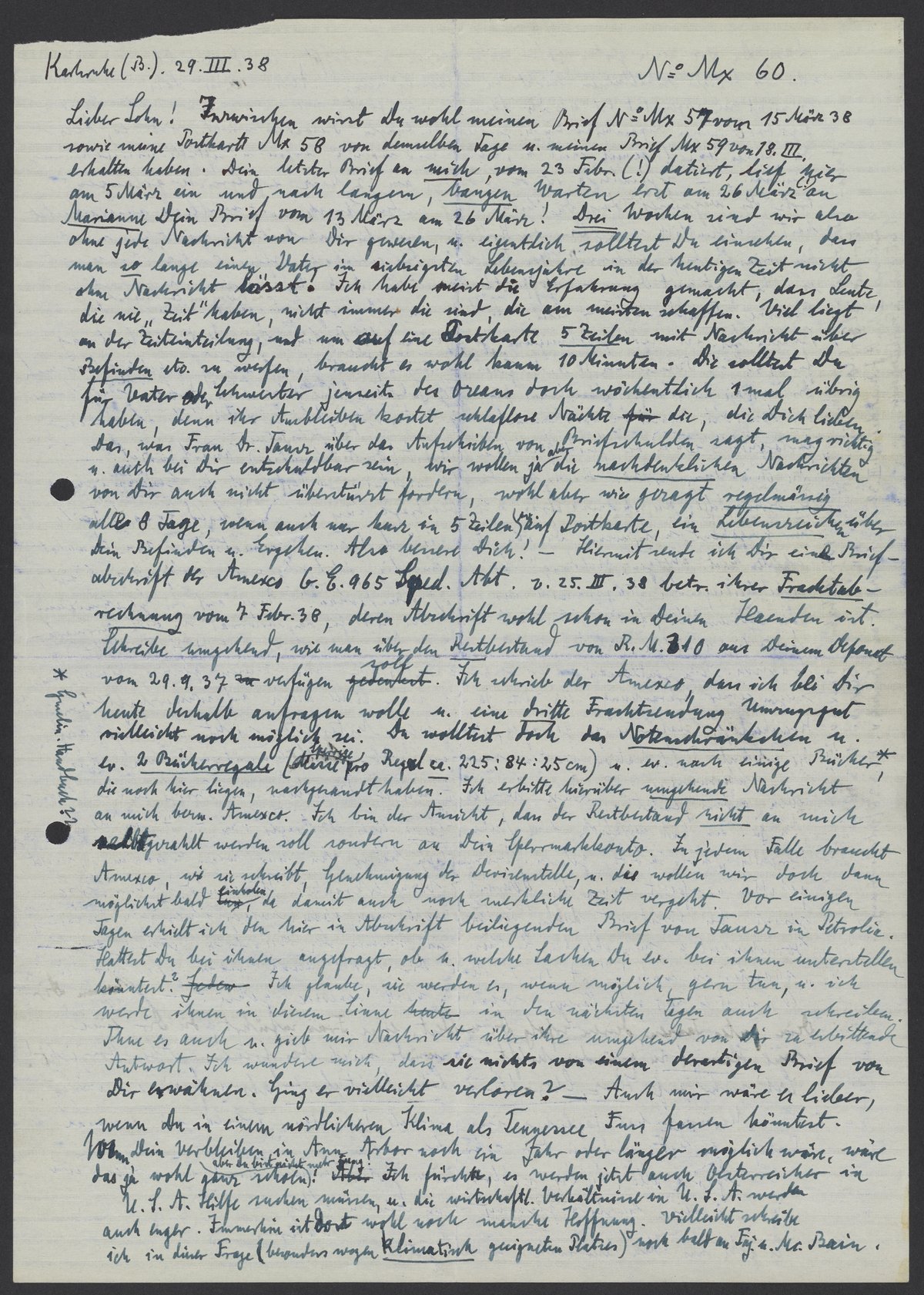 Lieber Sohn! Inzwischen wirst Du wohl meinen Brief No Mx 57 vom 15 März 38 sowie meine Postkarte Mx 58 von demselben Tage u. meinen Brief Mx 59 von 18.III erhalten haben. Dein letzter Brief an mich, vom 23 Febr. (!) datiert, lief hier am 5. März ein und nach langen, langen Warten erst am 26 Maerz an Marianne Dein Brief vom von 13 März an 26 März! Drei Wochen sind wir ohne jede Nachricht von Dir gewesen, u. eigentlich solltest Du einsehen, dass man so lange einen Vater im siebzigsten Lebensjahre in der heutigen Zeit nicht ohne Nachricht lässt! Ich habe meist die Erfahrung gemacht, dass Leute, die „Zeit“ haben, nicht immer die sind, die am meisten schaffen. Viel liegt an der Zeiteinteilung, und um eine Postkarte 5 Zeilen mit Nachricht über Befinden zu werfen, braucht es wohl kaum 10 Minuten. Die solltest Du für Vater und Schwester jenseits des Ozeans doch wöchentlich 1 mal übrig haben, denn ihr Ausbleiben kostet schlaflose Nächte für die, die Dich lieben. Das, war Frau Dr. Tausz über das Aufschreiben von Briefschulden sagt, mag richtig u. auch bei Dir entschuldbar sein, wir wollen ja aber die nachdenklicher Nachrichten von Dir auch nicht überstürzt fördern, wohl aber wie gesagt regelmässig alle 8 Tage, wenn auch nur kurz in 5 Zeilen u. auf Postkarte, ein Lebenszeichen über Dein Befinden u. Ergeben. Also bessere Dich! – Hiermit sende ich Dir einen Briefabschrift der Amexco G.E. 965 Sped. Abt. v. 25.III.38 betr. ihrer Frachtabrechnung vom 7 Febr. 38, deren Abschrift wohl schon in Deinen Händen ist. Schreibe umgehend, wie man über den Restbestand von R.M. 810 aus Deinem Deponat vom 29.9.37 verfügen soll. Ich schreibe der Amexco, dass ich bei Dir heute deshalb anfragen wolle u. eine dritte Frachtsendung Umzugsgut vielleicht noch möglich sei. Du solltest doch das Notenschränkschen u. ev. 2 Bücherregale (sperrige Masse pro Regal ca. 225: 84: 25 cm) u. ev. nach einige Bücher,* die noch hier liegen, nachgesandt haben. Ich erbitte hierüber umgehende Nachricht am mich bezw. Amexco. Ich bin der Ansicht, dass der Restbestand nicht an mich gezahlt werden soll sondern an Dein Sperrmarkkonto. In jedem Falle braucht Amexco, wie sie schreibt, Genehmigung der Devisenstelle u. die wollen wir doch dann möglichst bald einholen, da damit auch noch merkliche Zeit vergeht. Vor einigen Tagen erhielt ich den hier in Abschrift beiliegenden Brief von Tausz in Petrolia. Hattest Du bei ihnen angefragt, ob u. welche Sachen Du ev. bei ihnen unterstellen könntest? Ich glaube, sie werden es, wenn möglich, gern tun, u. ich werde ihnen in diesem Sinne in den nächsten Tagen auch schreiben. Thue es auch u. gieb mir Nachricht über ihre umgehend von Dir zu erbittende Antwort. Ich wundere mich, dass sie nichts von einem derartigen Brief von Dir erwähnen. Ging er vielleicht verloren? – Auch mir wäre es lieber, wenn Du in einem nördlichen Klima als Tennessee Fuss fassen könntest. Wenn Dein Verbleiben in Ann Arbor noch ein Jahr oder länger möglich wäre, wäre das ja wohl ganz schön! Ich fürchte, es werden jetzt auch Österreicher in U.S.A. Hilfe suchen müssen, ev. die wirtschaftl. Verhältnisse in U.S.A. werden auch enger. Immerhin ist dort wohl noch manche Hoffnung. Vielleicht schreibe ich in dieser Frage (besonders wegen klimatisch geeigneten Platzes) noch bald an Faj. u. McBain