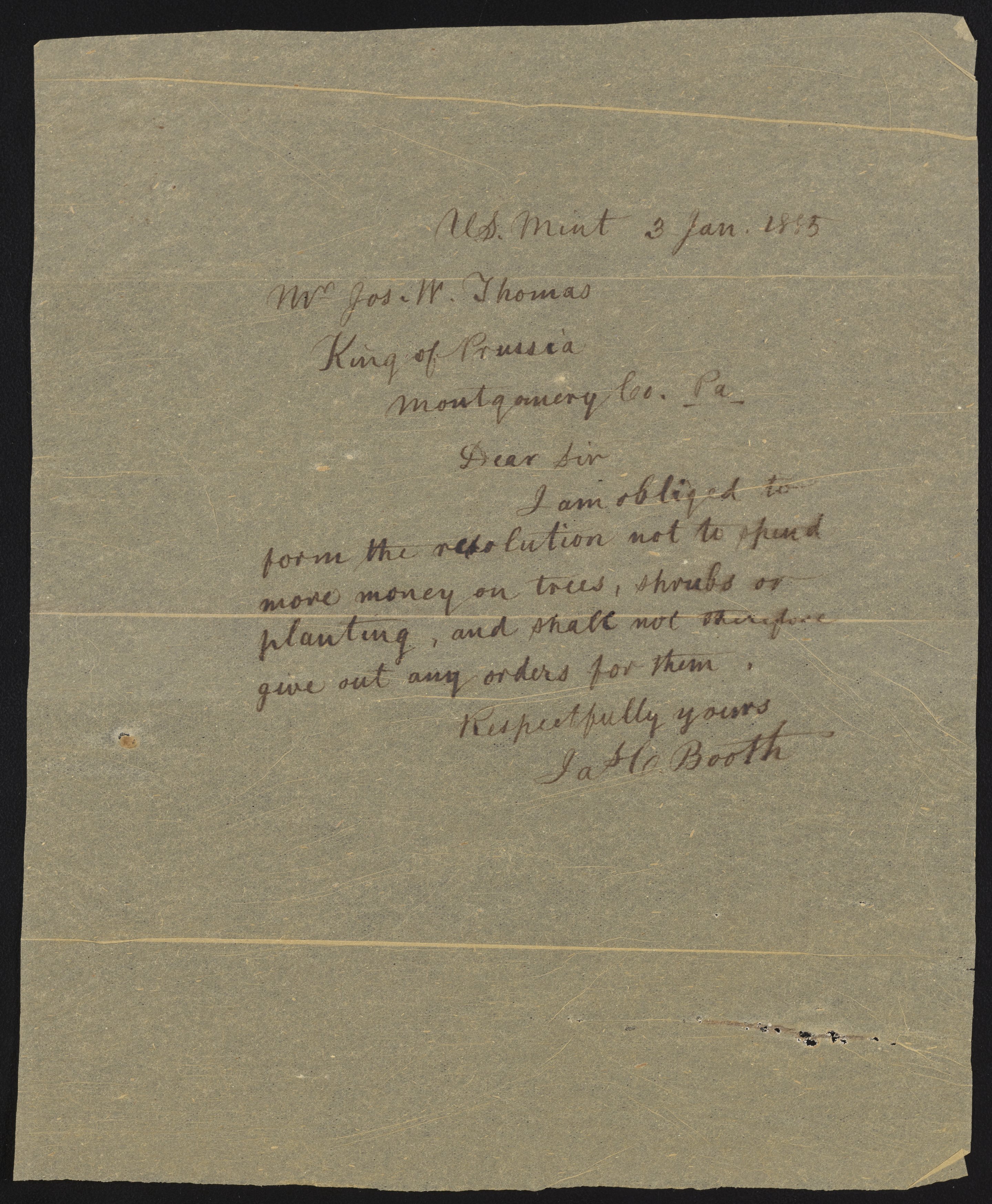 James Curtis Booth (1810-1888) informs Joseph W. Thomas that he will not be doing any more planting.