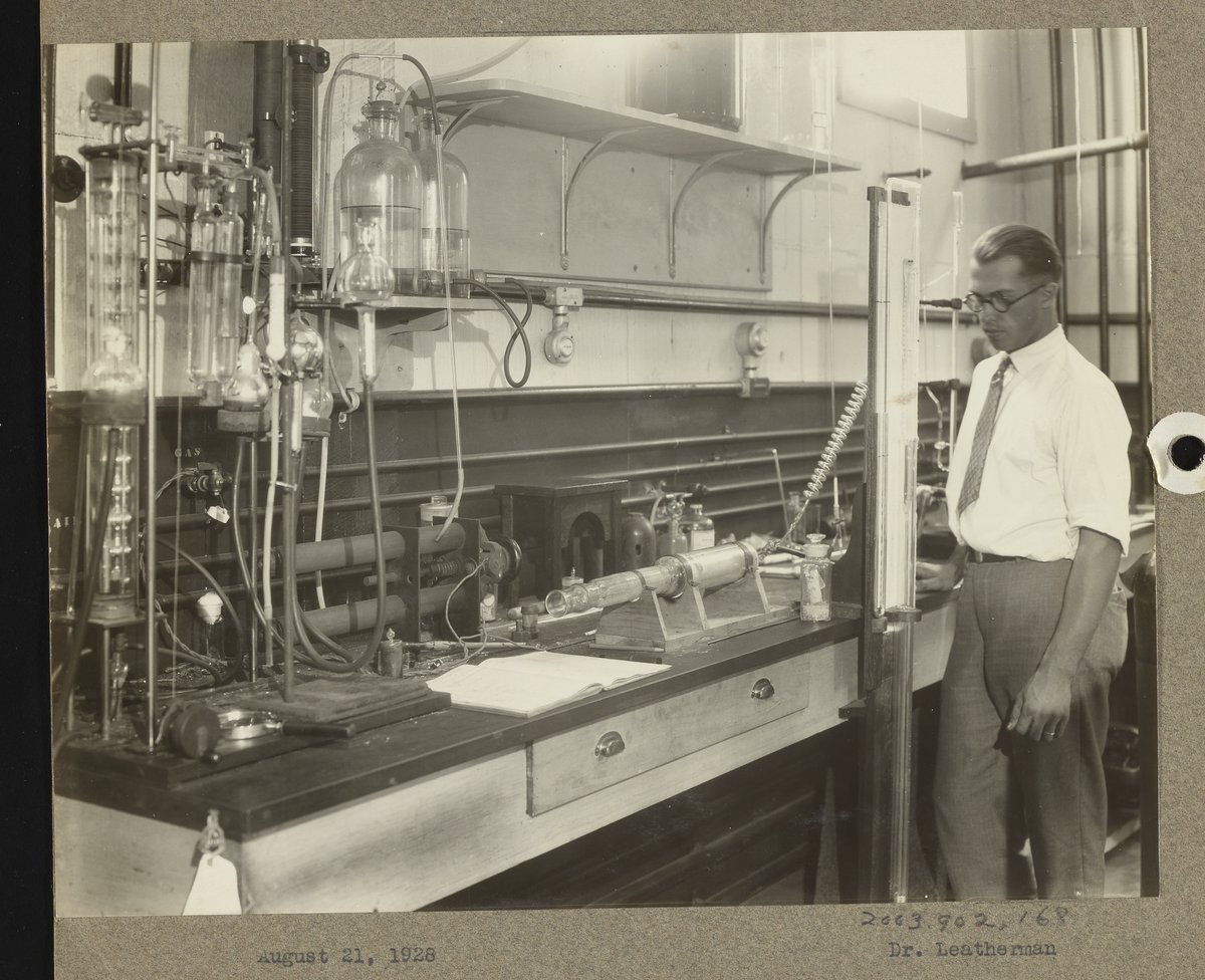 “Dr. Leatherman Determining Amount of Inert Gas in Nitrogen,” August 21, 1928. Travis P. Hignett Collection of Fixed Nitrogen Research Laboratory Photographs, Box 2. Science History Institute. Philadelphia. https://digital.sciencehistory.org/works/x059c745c.