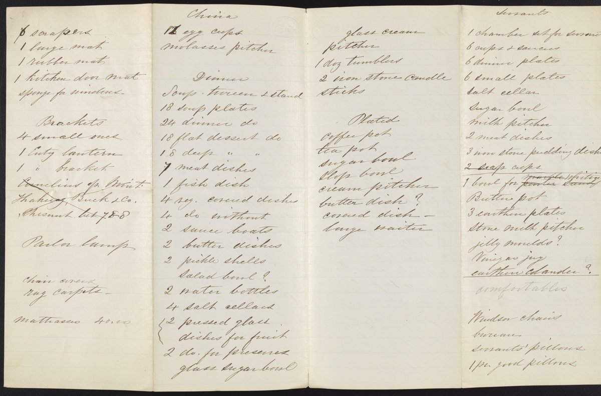 Small JPG1200 x 1476px — 197 KBLarge JPG2880 x 3543px — 985 KBFull-sized JPG5166 x 6356px — 2.8 MBOriginal fileTIFF — 5166 x 6356px — 94.0 MBA list of household items separated by topic including tinware, bushels, parlor lamps, china, dinner, woodenware, and hardware.