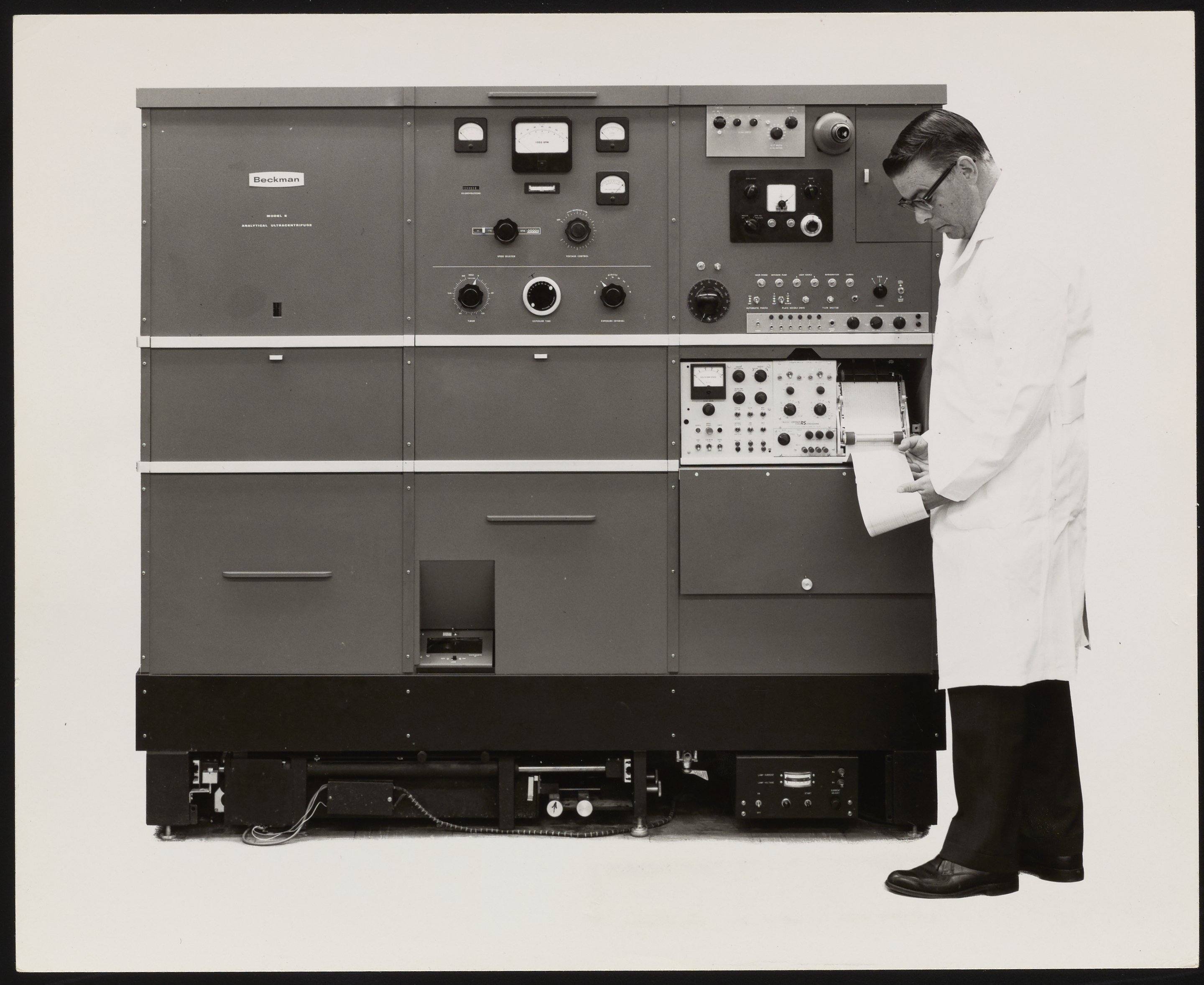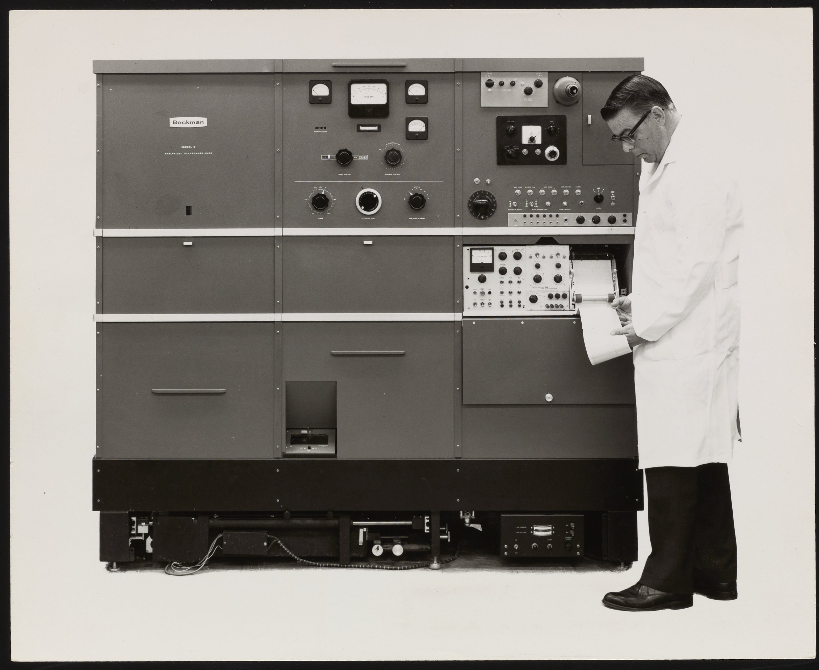 “Man Examining Readout on a Model E Centrifuge,” 1950–1959. Beckman Historical Collection, Box 59, Folder 140. Science History Institute. Philadelphia. https://digital.sciencehistory.org/works/x346d4190.
