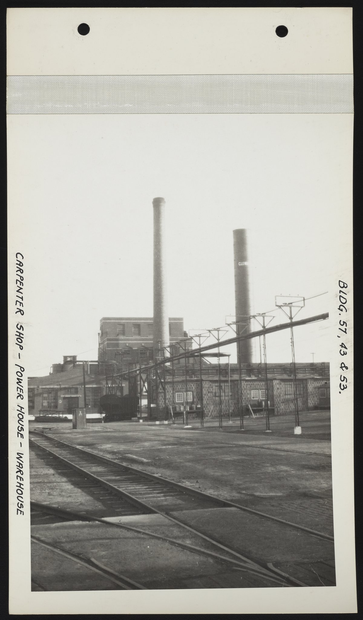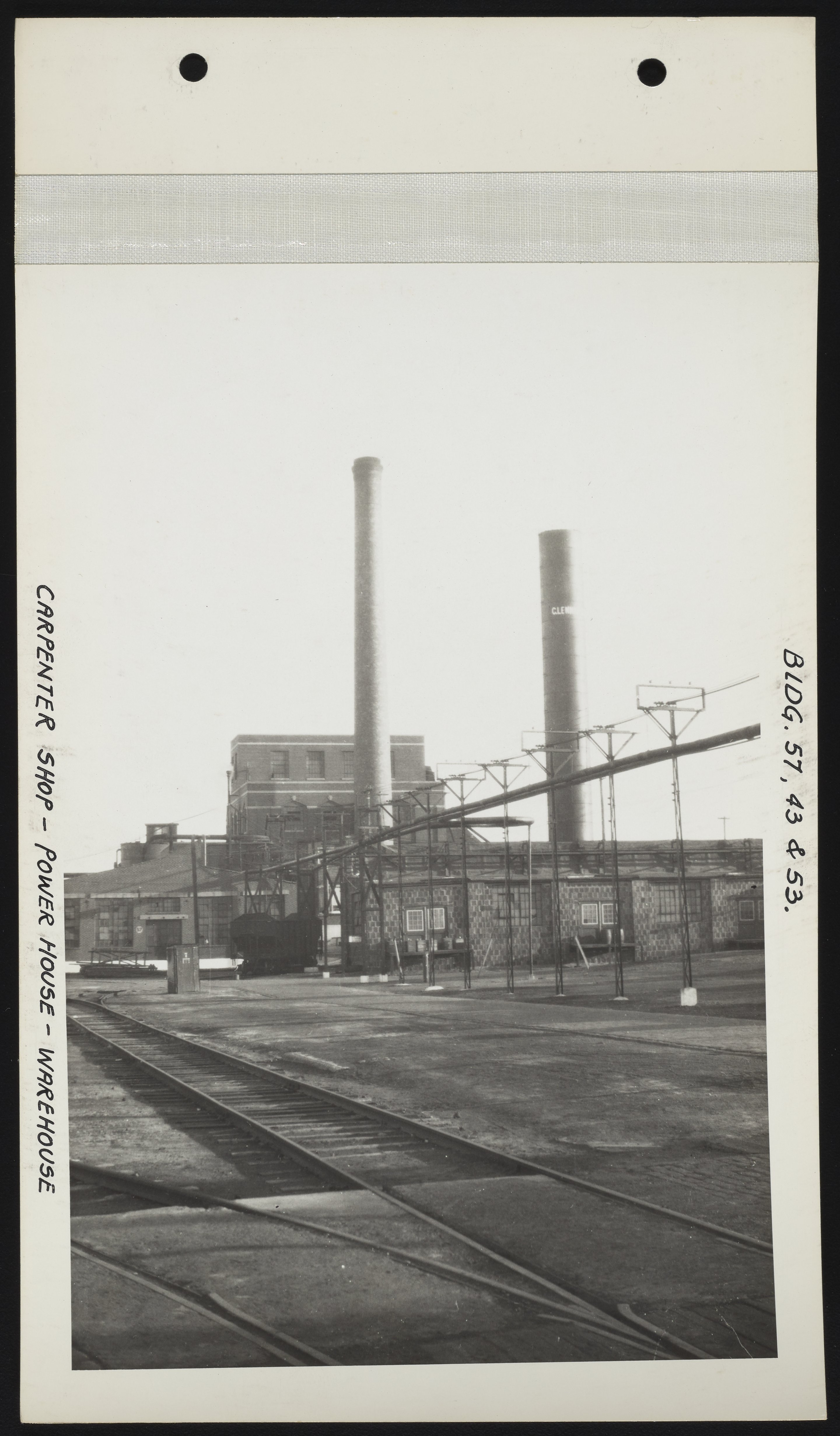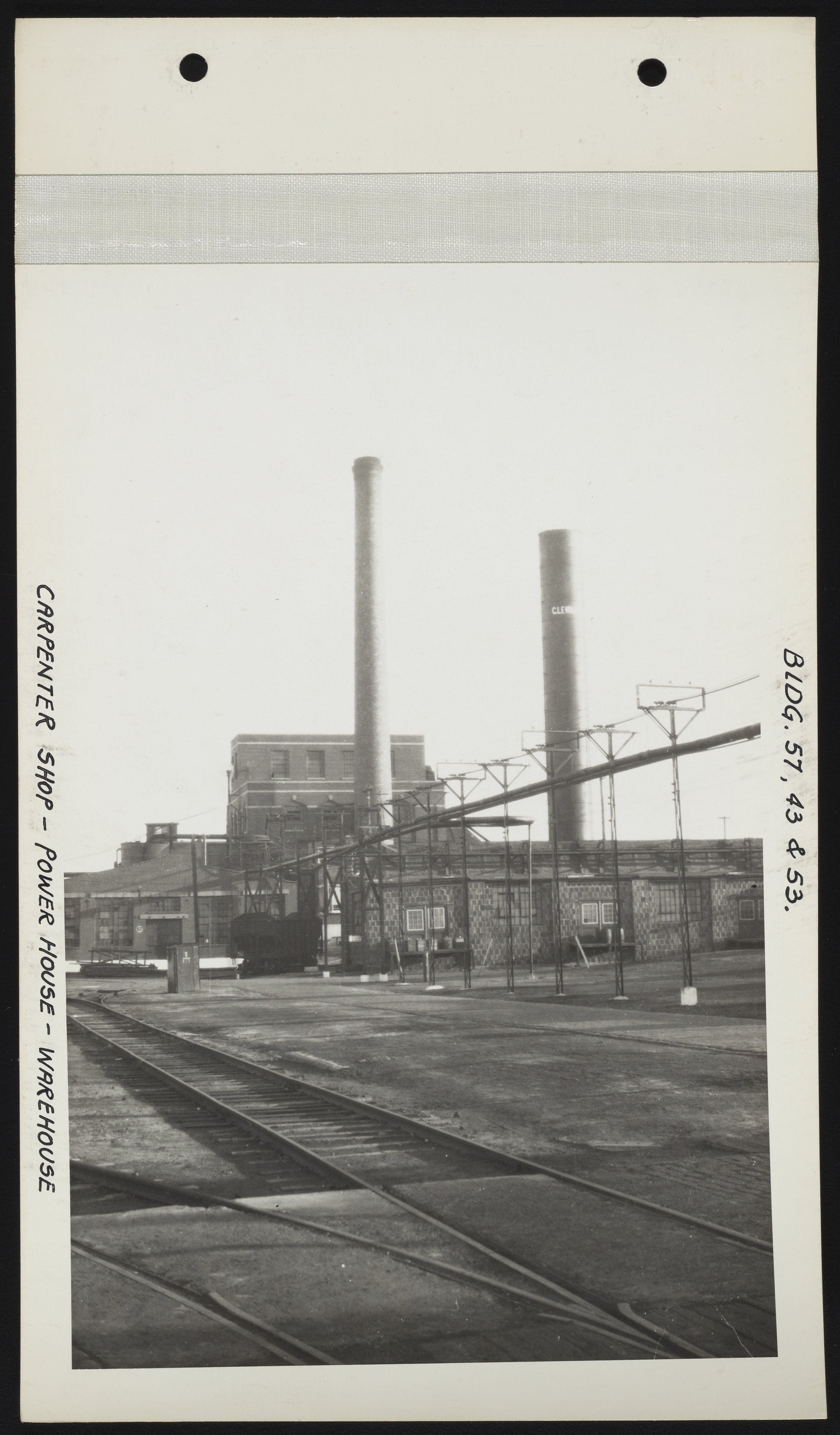 General view of the carpenter shop (Building 57), power house (Building 43), and warehouse (Building 53) at the Charles Lennig and Company chemical manufacturing plant in Bridesburg, a neighborhood located along the Delaware River in the Northeast section of Philadelphia, Pennsylvania. Charles Lennig and Company operated as a subsidiary of the Rohm and Haas Company, an international chemical company headquartered in Philadelphia, from 1920 to 1947.