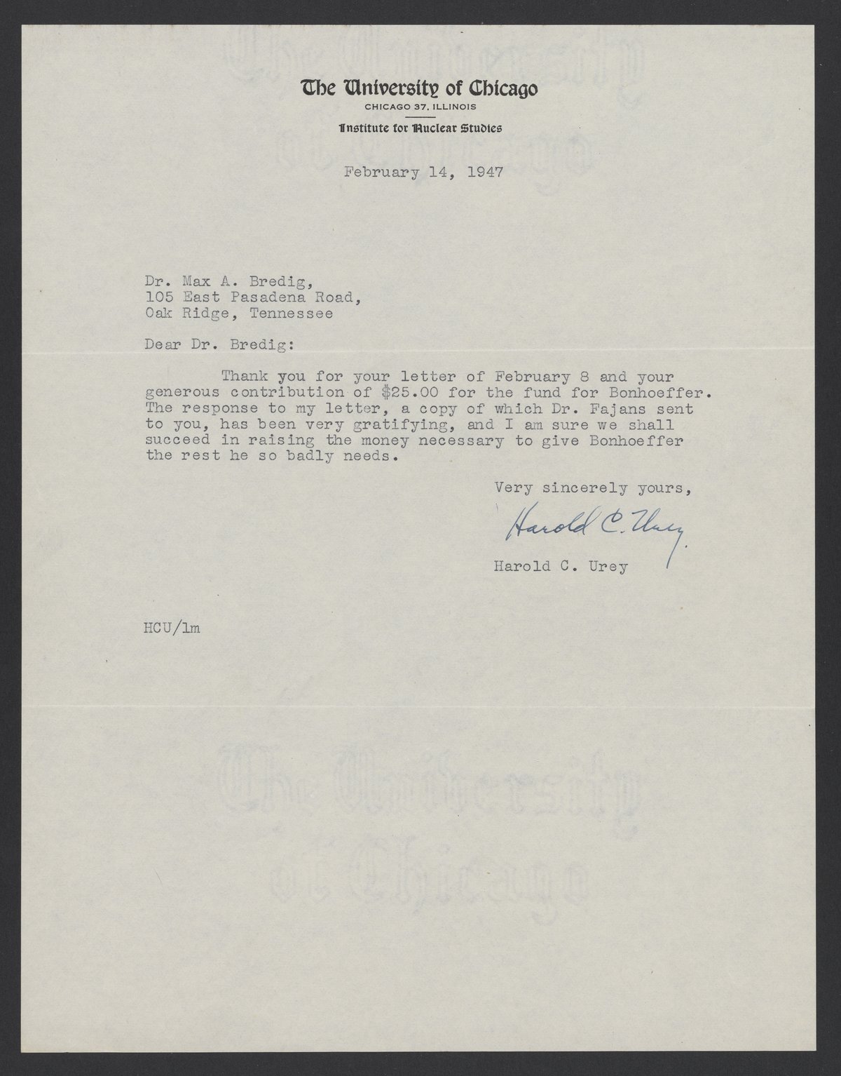 Harold C. Urey (1893-1981) thanks Max Bredig (1902-1977) for contributing to a fund for Karl Friedrich Bonhoeffer (1899-1957). The fund intends to help Bonhoeffer recover from angina pectoris (chest pain).