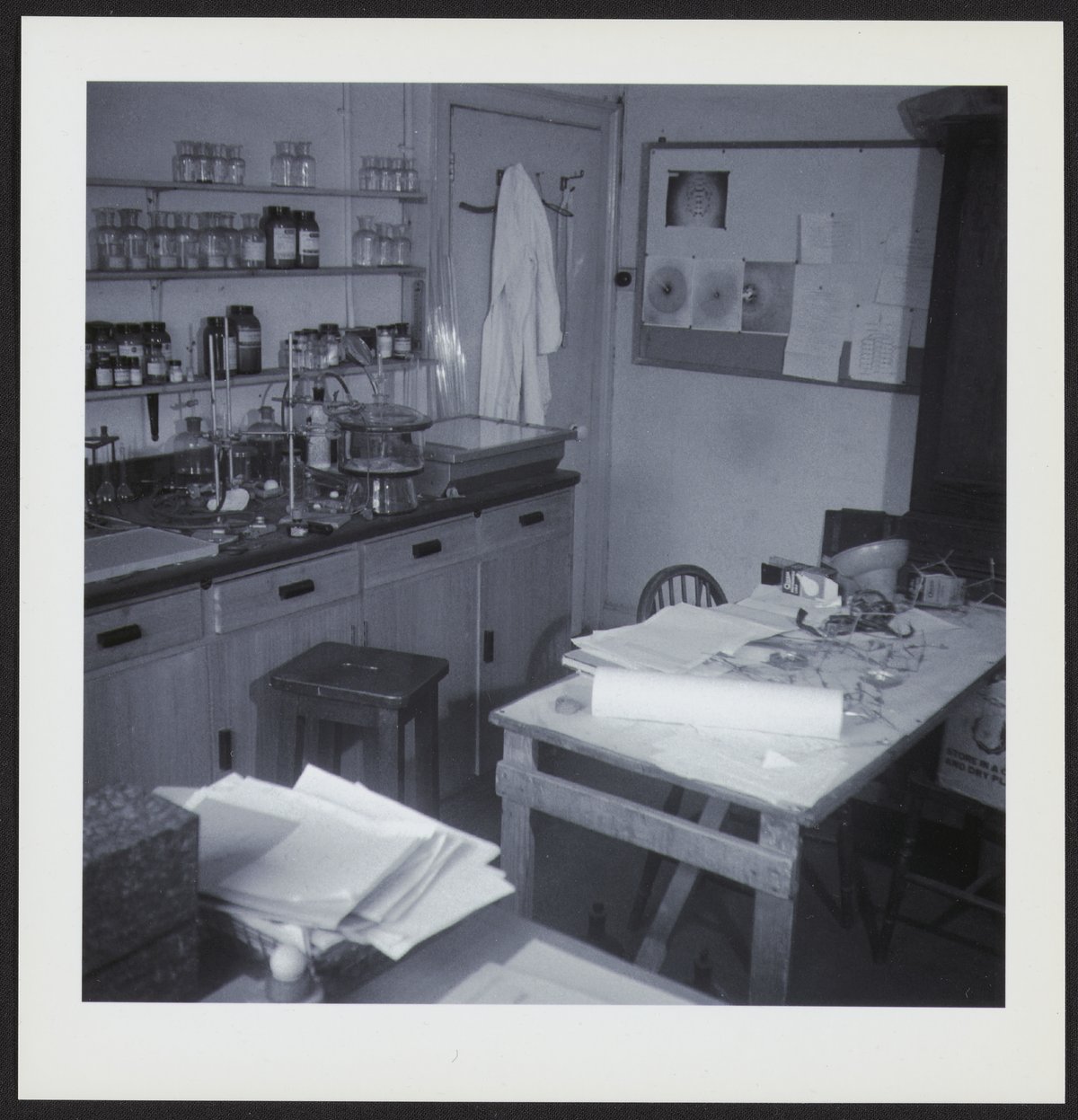 Black and white photograph of Rosalind Franklin's (1920–1958) laboratory at Birkbeck College, taken shortly after her death.