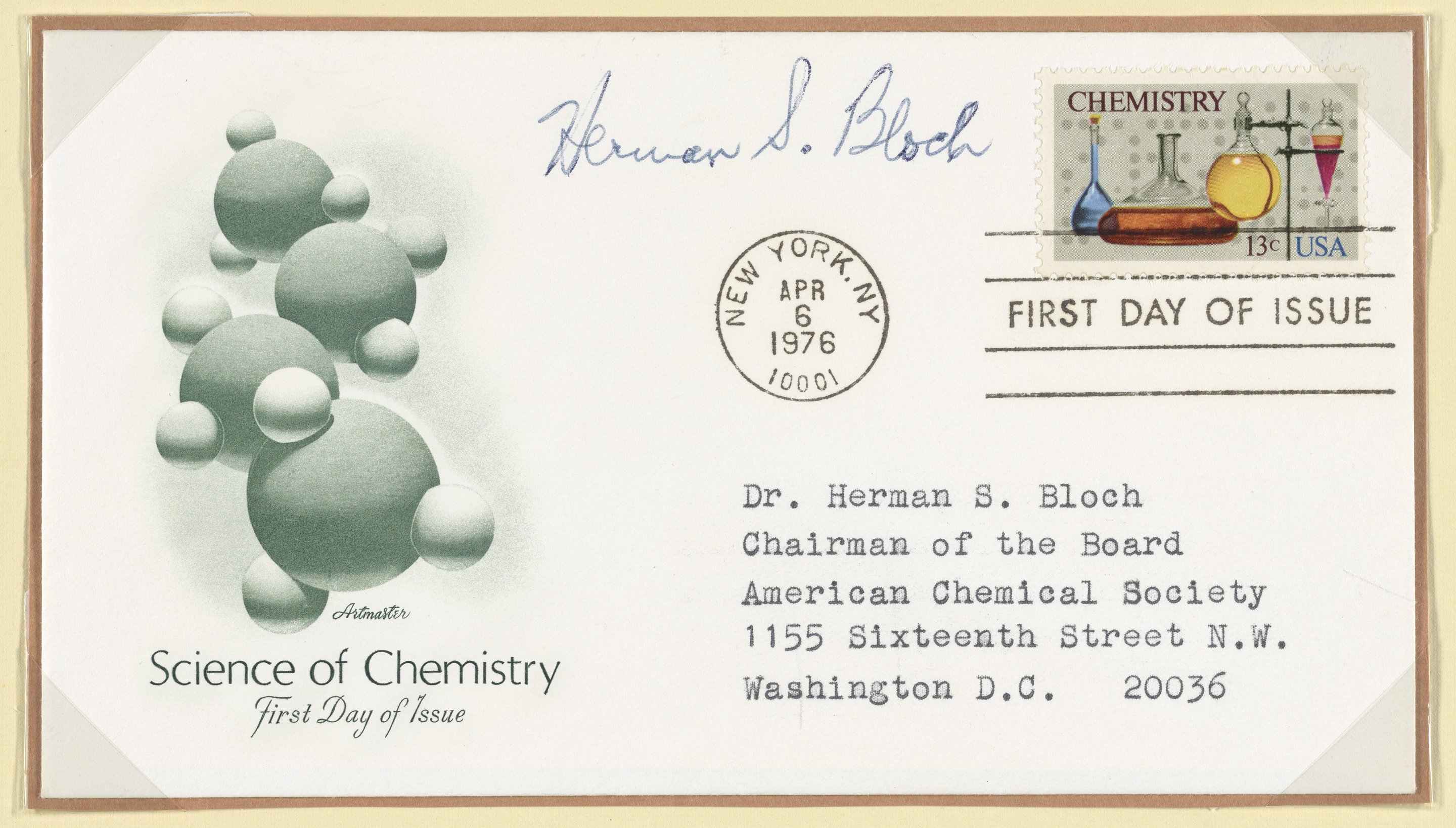 Artmaster. “First Day Cover Commemorating the ‘Science of Chemistry.’” United States, 1976. Witco Stamp Collection, Box 6. Science History Institute. Philadelphia. https://digital.sciencehistory.org/works/x633f1090.
