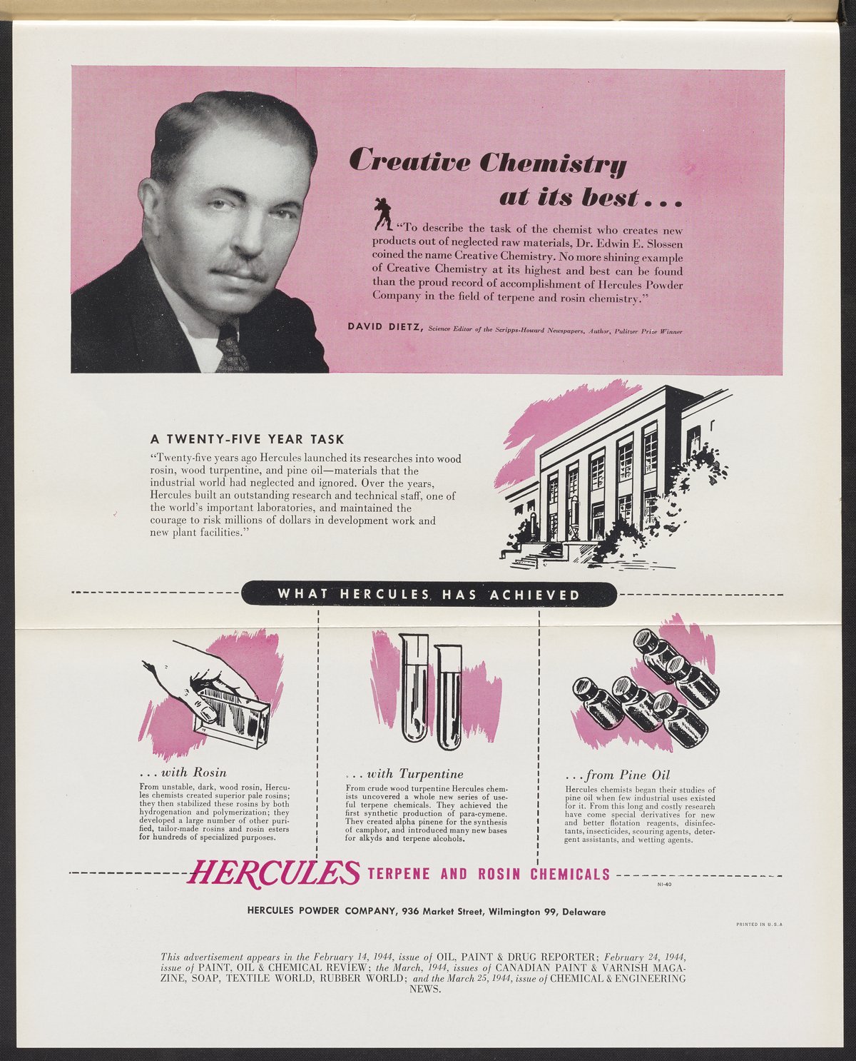 Hercules Incorporated. “Creative Chemistry at Its Best...What Hercules Has Achieved.” 1944 Hercules Advertisements, 1944. Records of Hercules Incorporated, Volume 1944. Science History Institute. Philadelphia. https://digital.sciencehistory.org/works/x633f1749.