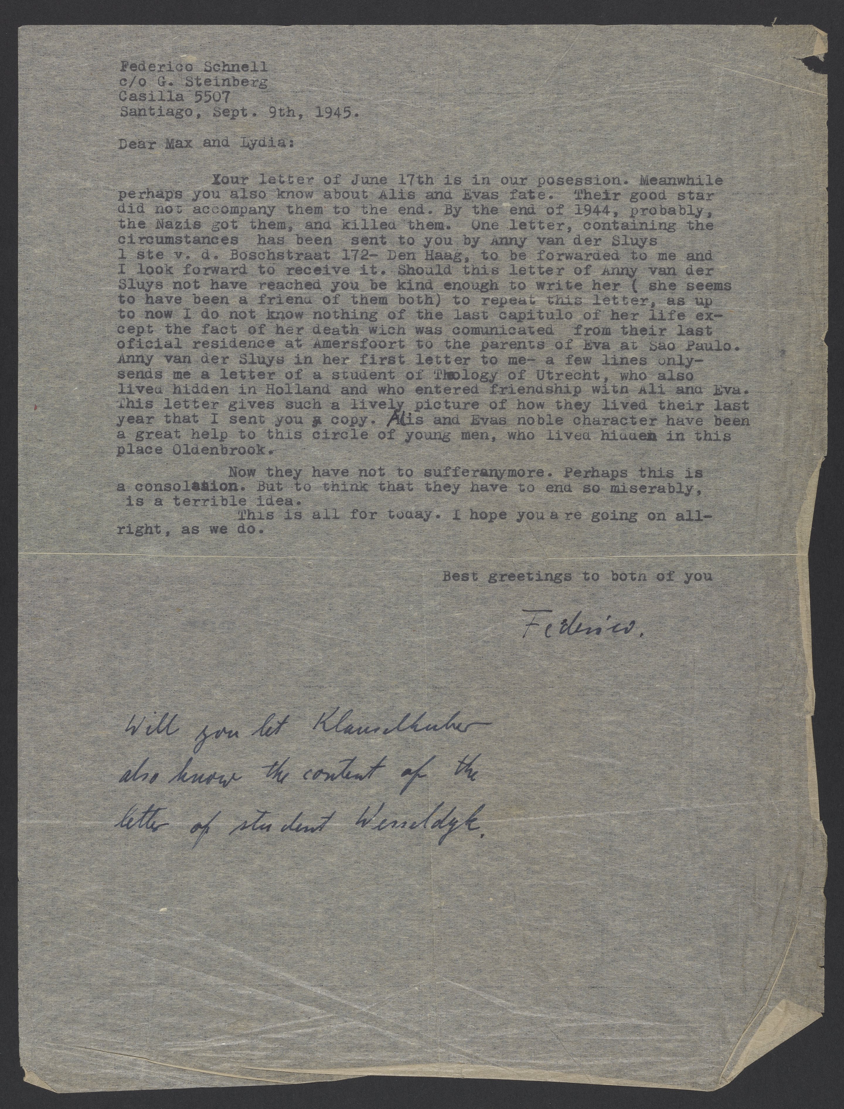 Letter from Federico Schnell to Max and Lydia Bredig, September 9, 1945