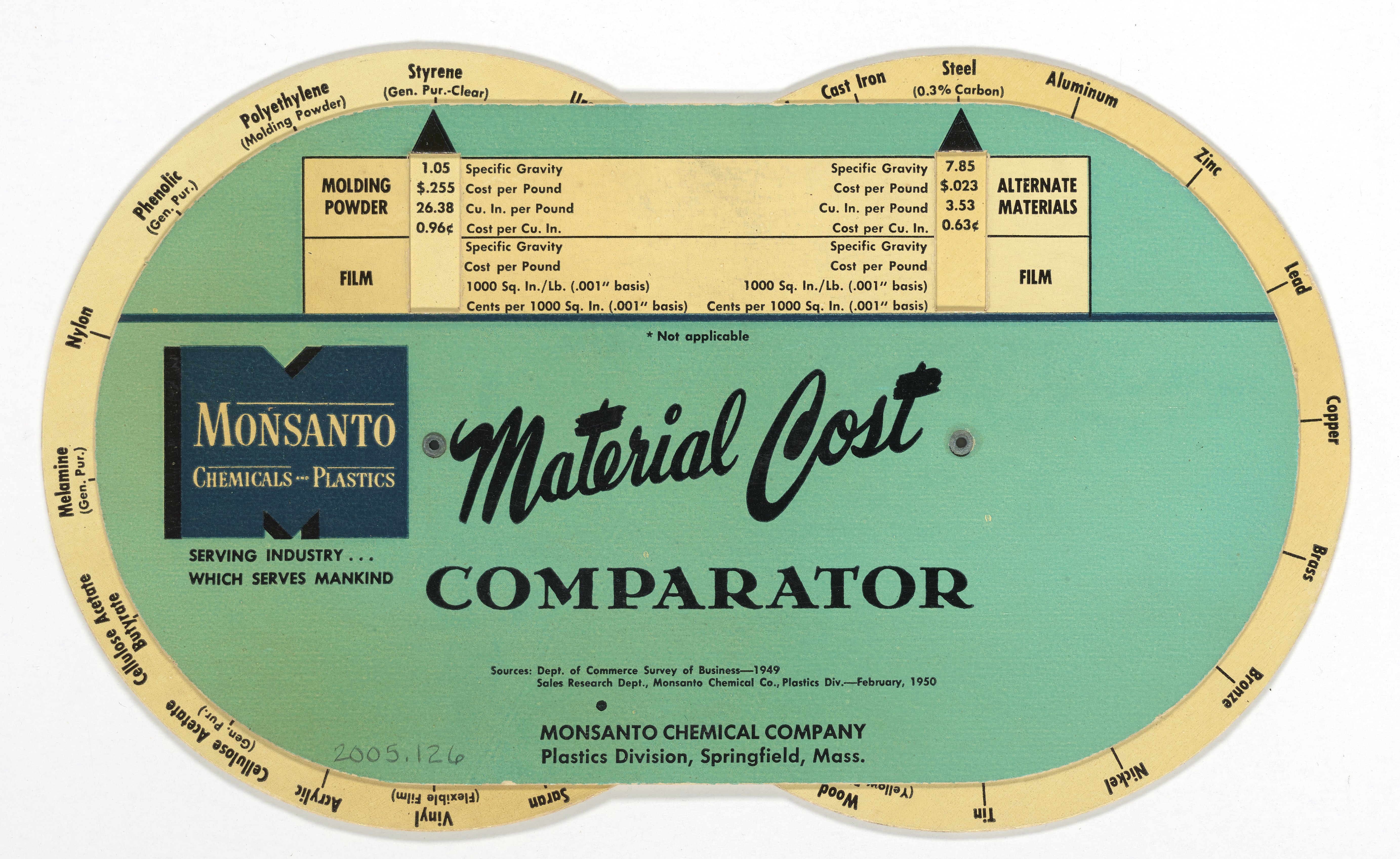 A comparator device constructed from two rotating cardboard wheels attached to a cardboard cover. One side displays plastic properties and the other displays the material costs for products manufactured by the Monsanto Chemical Company. On the plastics side, two cutouts show mechanical, thermal, optical, electrical, and chemical property data based on the wheels' orientation. The material cost side compares polymer and "alternate material" products; the two cutouts display pricing data based on the quantity and form of material.