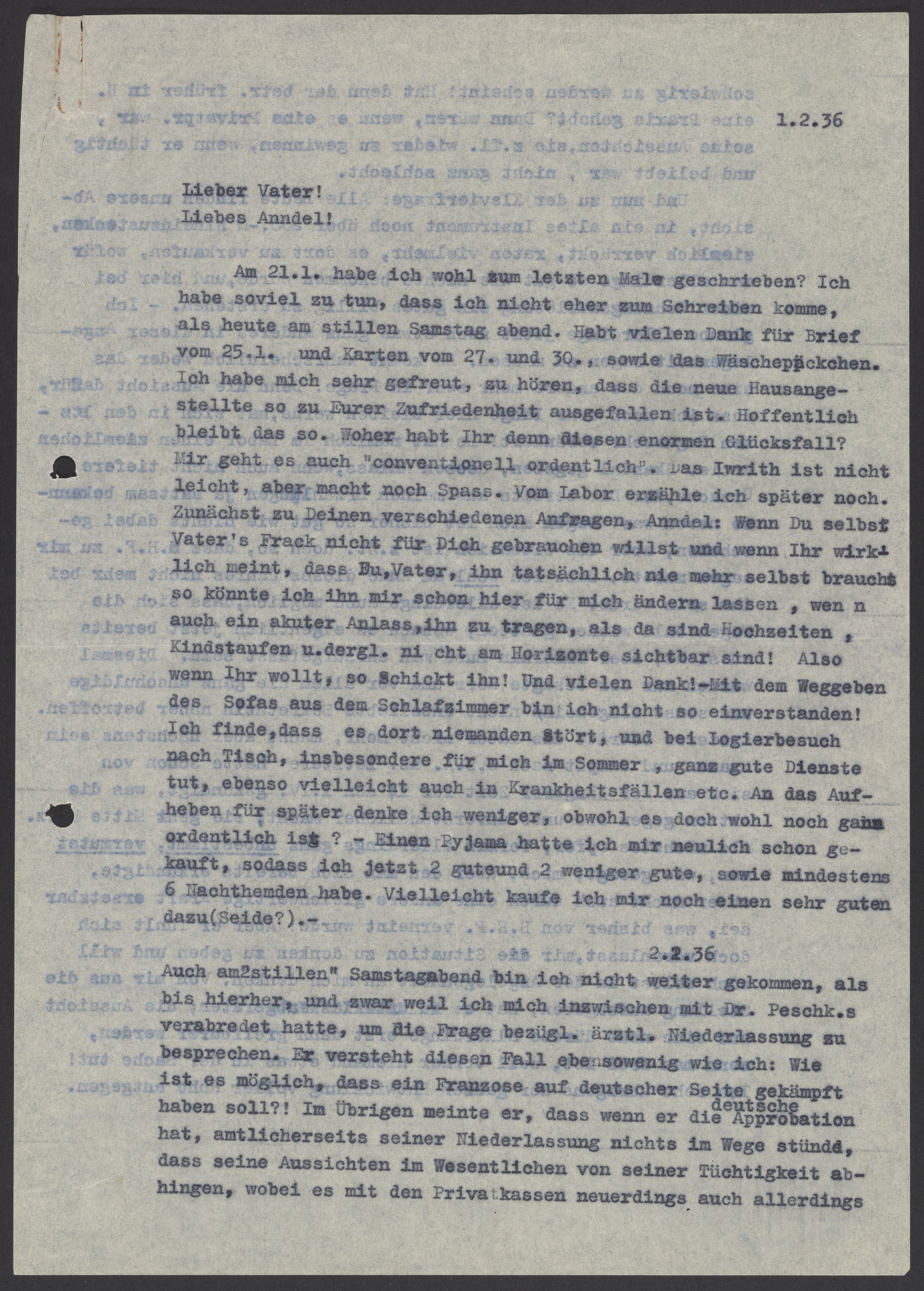 I probably haven’t written since January 21st. I’ve been so busy that I couldn’t find time to write until now, on a quiet Saturday evening. Thank you very much for the letter you sent on the 25th, as well as the cards you sent on January 27th and 30th, and for the laundry package. I was very pleased to hear that the new maid is working out well. Hopefully, it will continue that way. Where did you find such good luck? I’m also doing well. Hebrew isn't easy, but it's still enjoyable. I'll tell you more about the laboratory later. Regarding your various inquiries, Anndel: if you don't plan to use Father’s tailcoat and Father, you believe that you won’t need it either, I could have it tailored for me here. I could wear it in case there are weddings, baptisms, or other occasions in the future. So, if you don't need it, please send it. Thank you very much! Regarding the sofa in the bedroom, I don't agree with giving it away. I think it doesn't bother anyone there, and it's useful for guests who stay after dinner, especially in the summer. It may also be useful in cases of illness. I’m not thinking too much about saving it for later, although it's probably still in good condition. I recently bought a pair of pajamas, so now I have two good pairs and two less good ones. I also have at least six nightshirts. Maybe I’ll buy a very good one made of silk.
