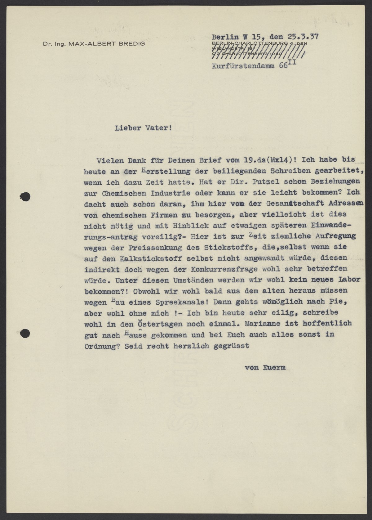 Many thanks for your letter from the 19th of this month. To date, I have worked on composing the enclosed letters when I had time. Does Director Putsel already have connections to the chemical industry, or can he get them easily? I already thought about procuring the addresses of chemical companies for him from the embassy. Is this perhaps unnecessary and premature, especially in view of future immigration applications? At the moment, there is a lot of anxiety regarding the price reduction of nitrogen. Even if this price reduction did not apply to calcium cyanamide itself, it would still affect it indirectly because of market competition. Under these circumstances, we will probably not get a new laboratory! However, we will have to move out of the old one soon because of the new canal construction on the Spree River. Then we’ll perhaps move to Pie, but most likely without me! I am in a big hurry today, but I will probably write again over Easter. I hope Marianne arrived home safely and everything is alright with you. Greetings from your son!