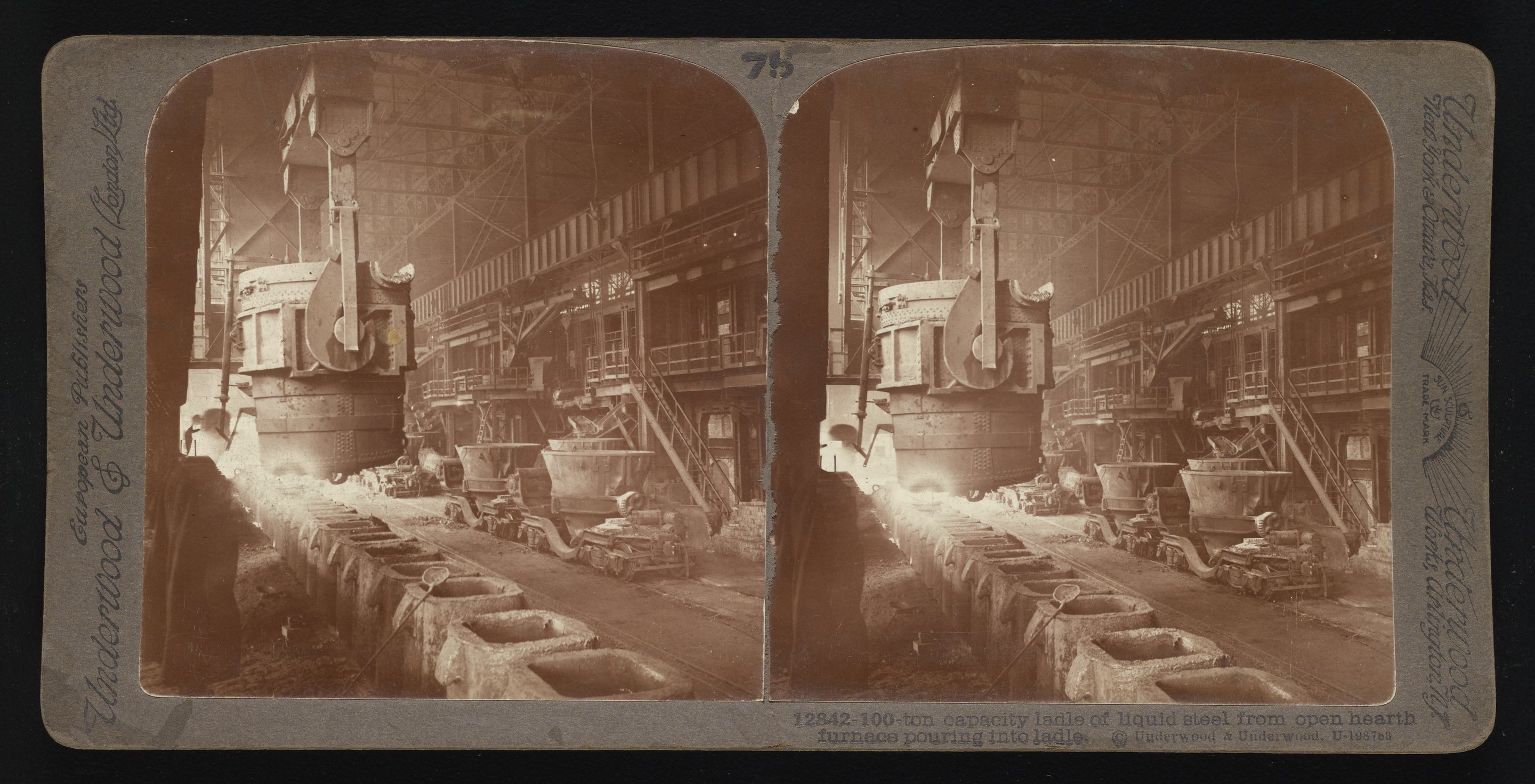 100-ton capacity ladle of liquid steel from open hearth furnace pouring into ladle