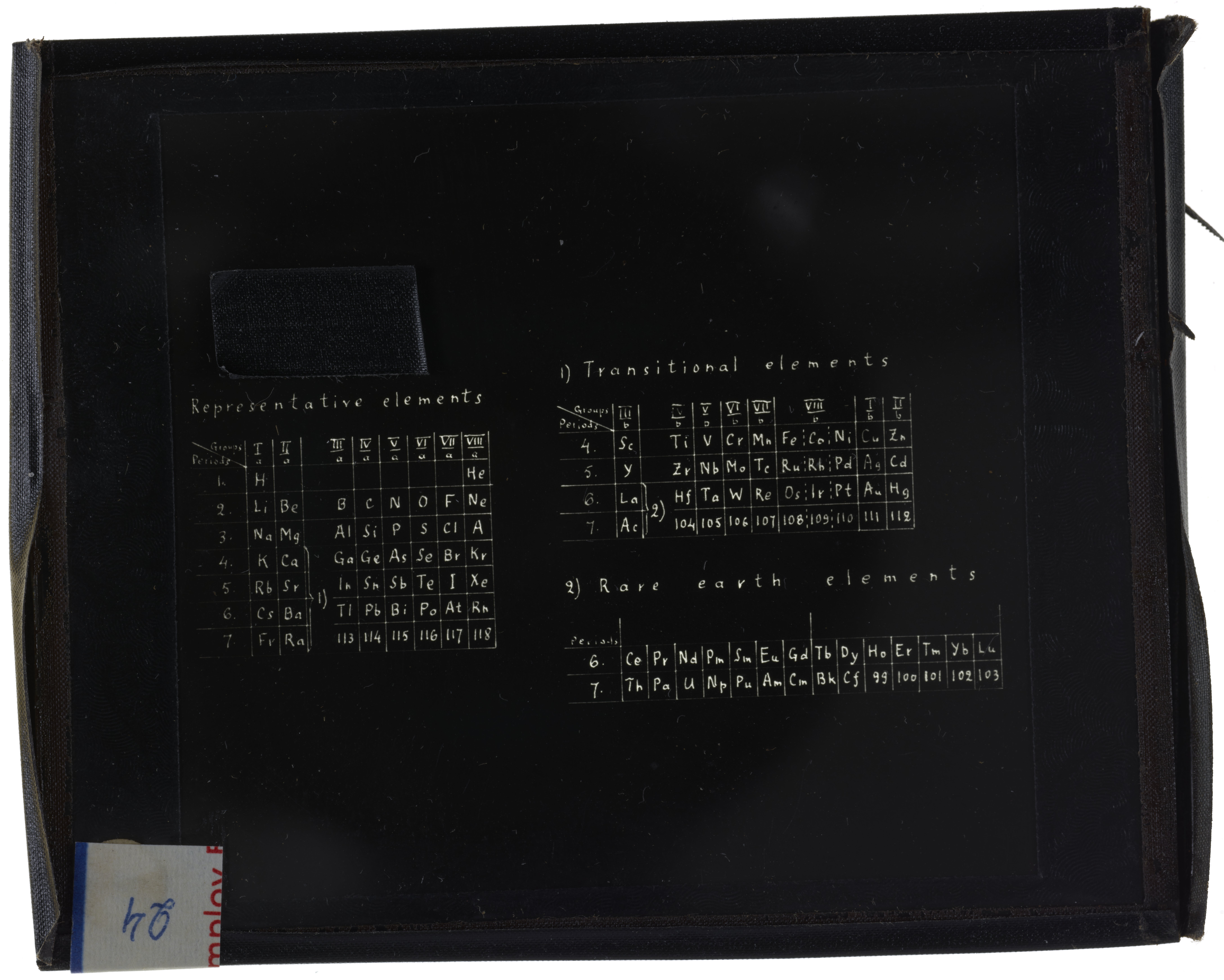 Smith, J.D. Main (John David Main), and Edward G. Mazurs. “Series Table of Representative Elements with Supplementary Tabulations for Transitional and Rare Earth Elements.” Glass (material), circa 1927–1957. Edward G. Mazurs Collection of Periodic Systems Images, Box 1. Science History Institute. Philadelphia. https://digital.sciencehistory.org/works/x920fx40j.