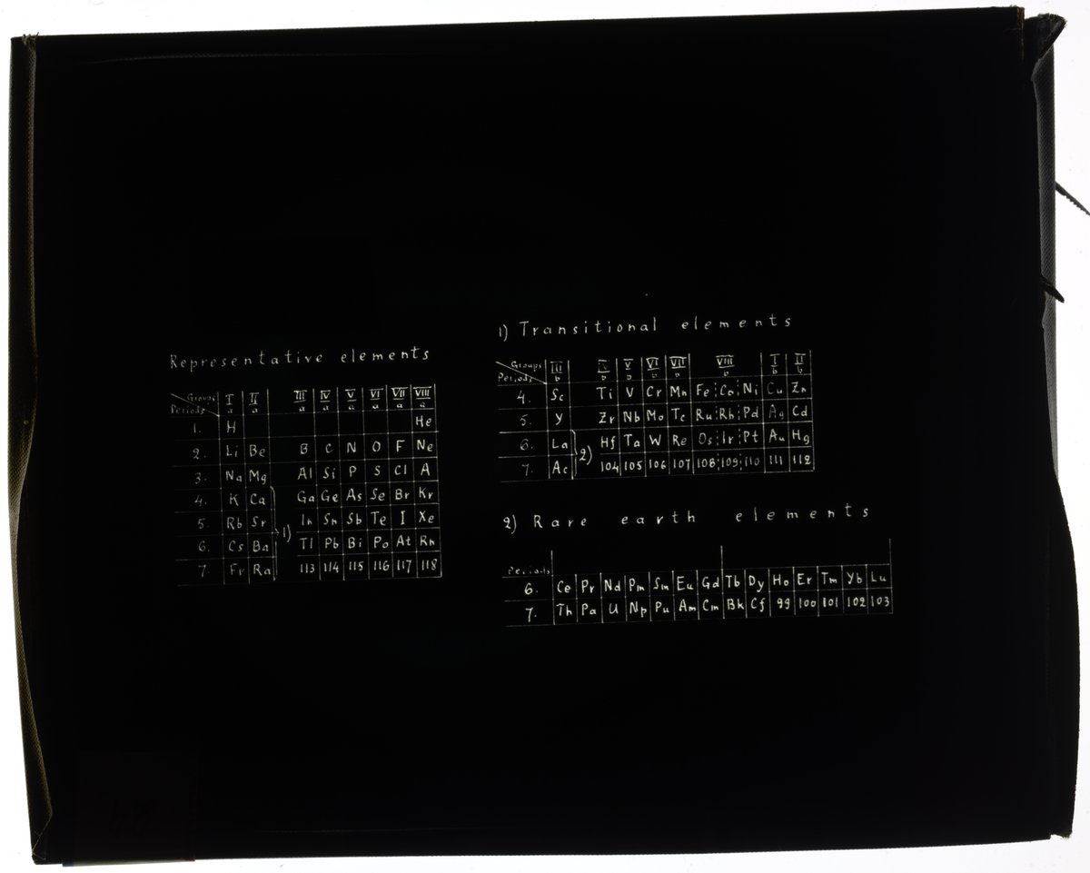 Smith, J.D. Main (John David Main), and Edward G. Mazurs. “Series Table of Representative Elements with Supplementary Tabulations for Transitional and Rare Earth Elements.” Glass (material), circa 1927–1957. Edward G. Mazurs Collection of Periodic Systems Images, Box 1. Science History Institute. Philadelphia. https://digital.sciencehistory.org/works/x920fx40j.