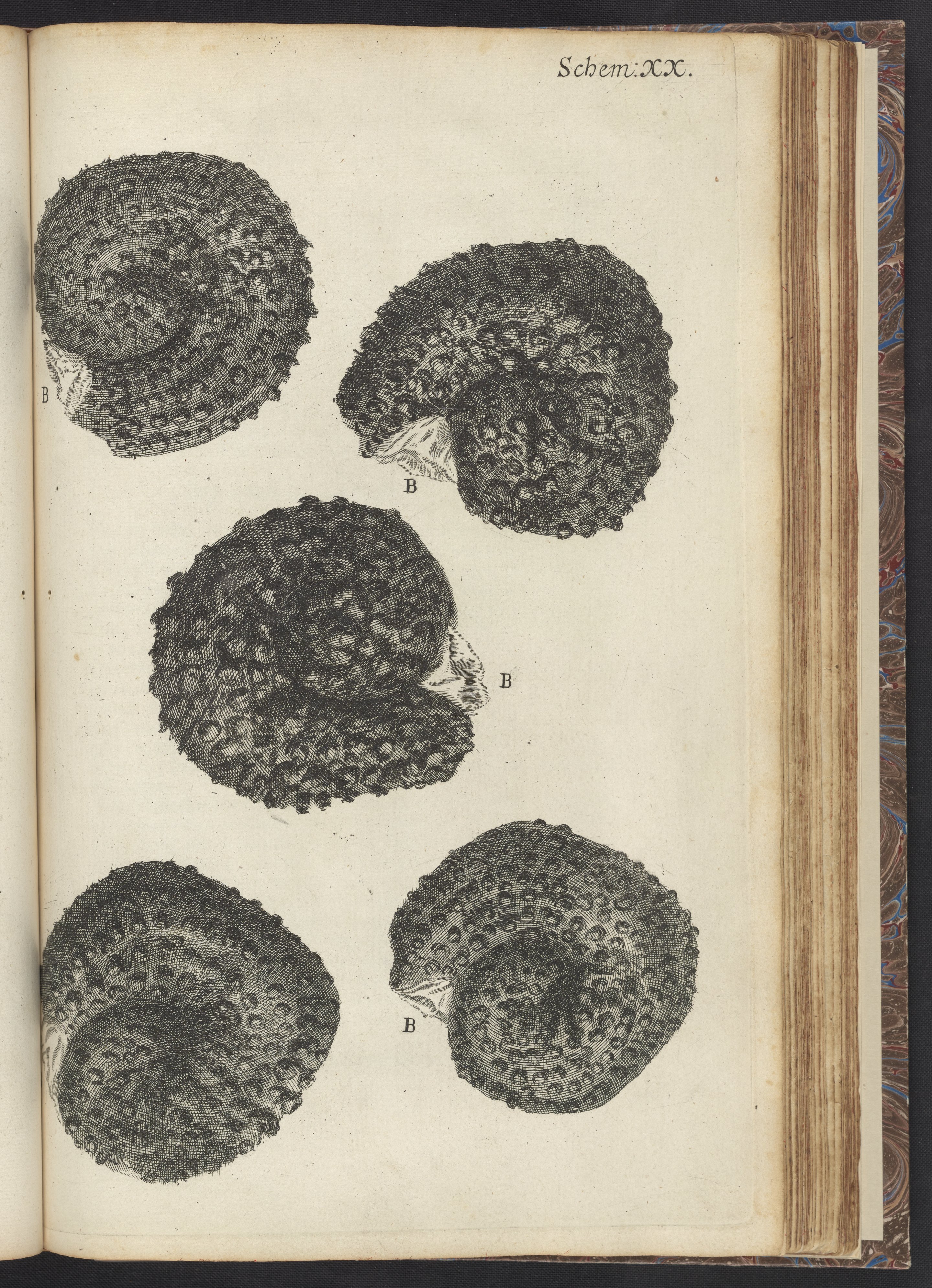Engravings from Schem. 20 of the first edition of Robert Hooke's seminal volume, Micrographia : or, Some physiological descriptions of minute bodies made by magnifying glasses. With observations and inquiries thereupon. Depicted here are an assortment of purslane seeds that are the subject of Hooke's experiments in Observation XXXI.
