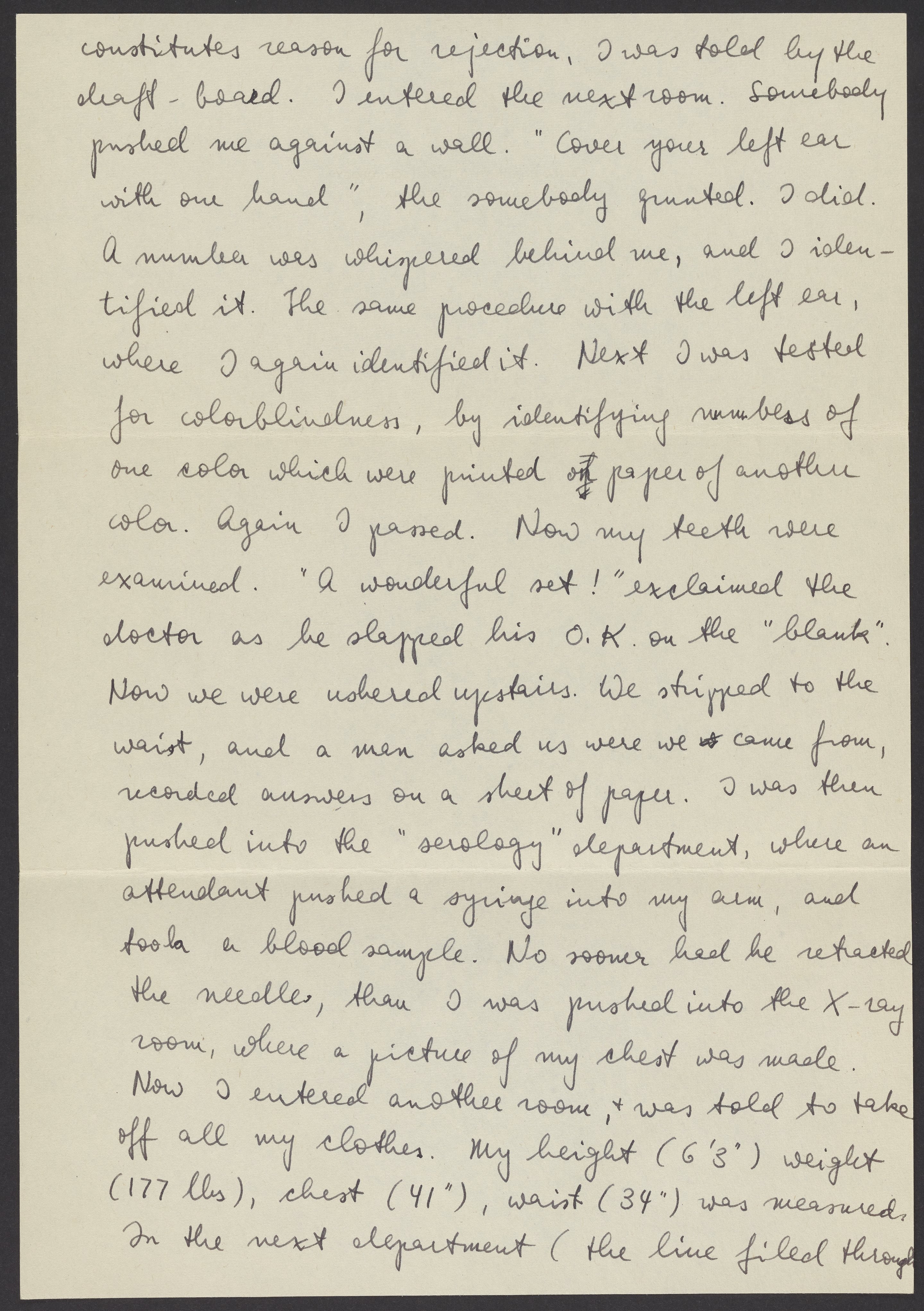 Small JPG1200 x 1717px — 277 KBLarge JPG2880 x 4121px — 1.7 MBFull-sized JPG4577 x 6549px — 4.3 MBOriginal fileTIFF — 4577 x 6549px — 85.8 MBLetter from Kurt M. Mislow (1923-2017) to his parents, Ida and Max. Mislow tells his father how proud he is of him, and then details a physical examination he had with other students from the California Institute of Technology.