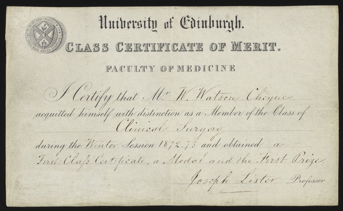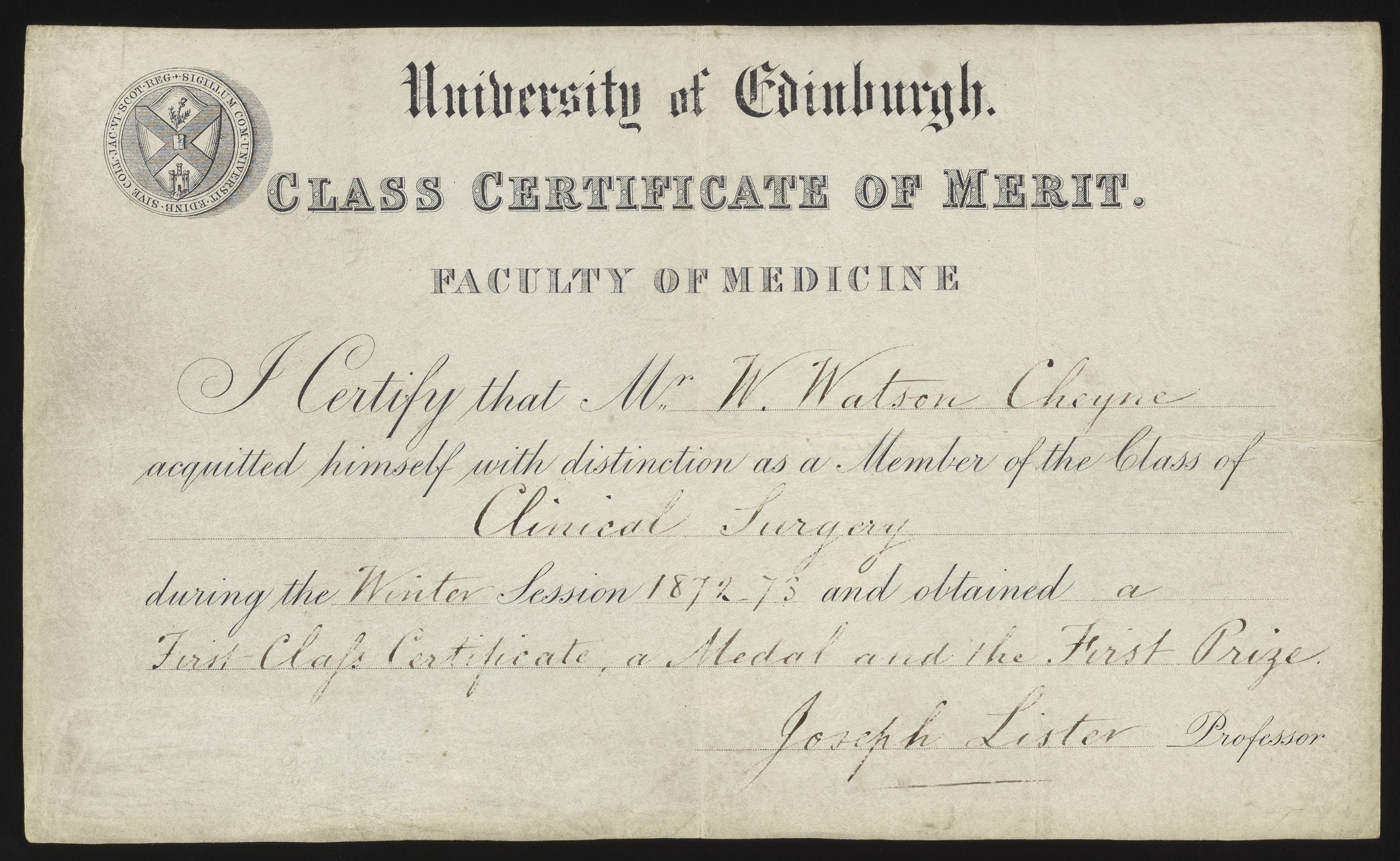 Certifies W. Watson Cheyne as a Member of the Class of "Clinical Surgery," 1872-1873 and obtained "a First Class Certificate, a Medal and the First Prize." Signed by Professor Joseph Lister.