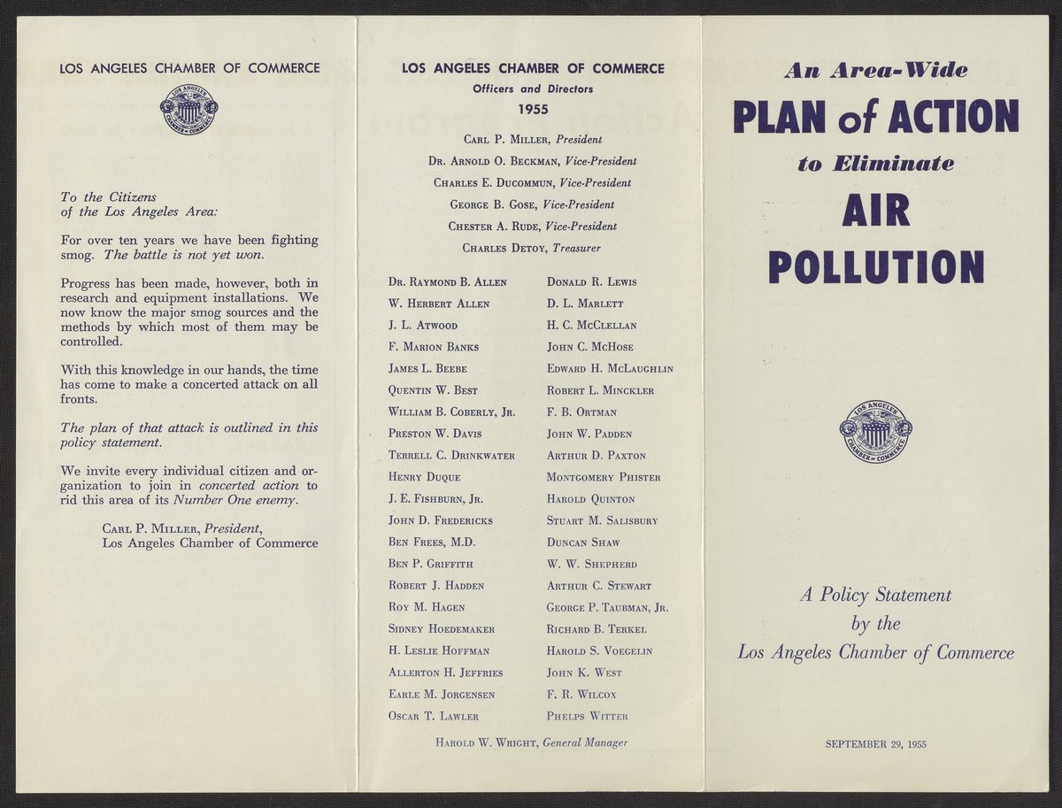 Los Angeles Chamber of Commerce. “An Area-Wide Plan of Action to Eliminate Air Pollution,” September 29, 1955. Beckman Historical Collection, Box 1, Folder 30. Science History Institute. Philadelphia. https://digital.sciencehistory.org/works/xd07gt24p.