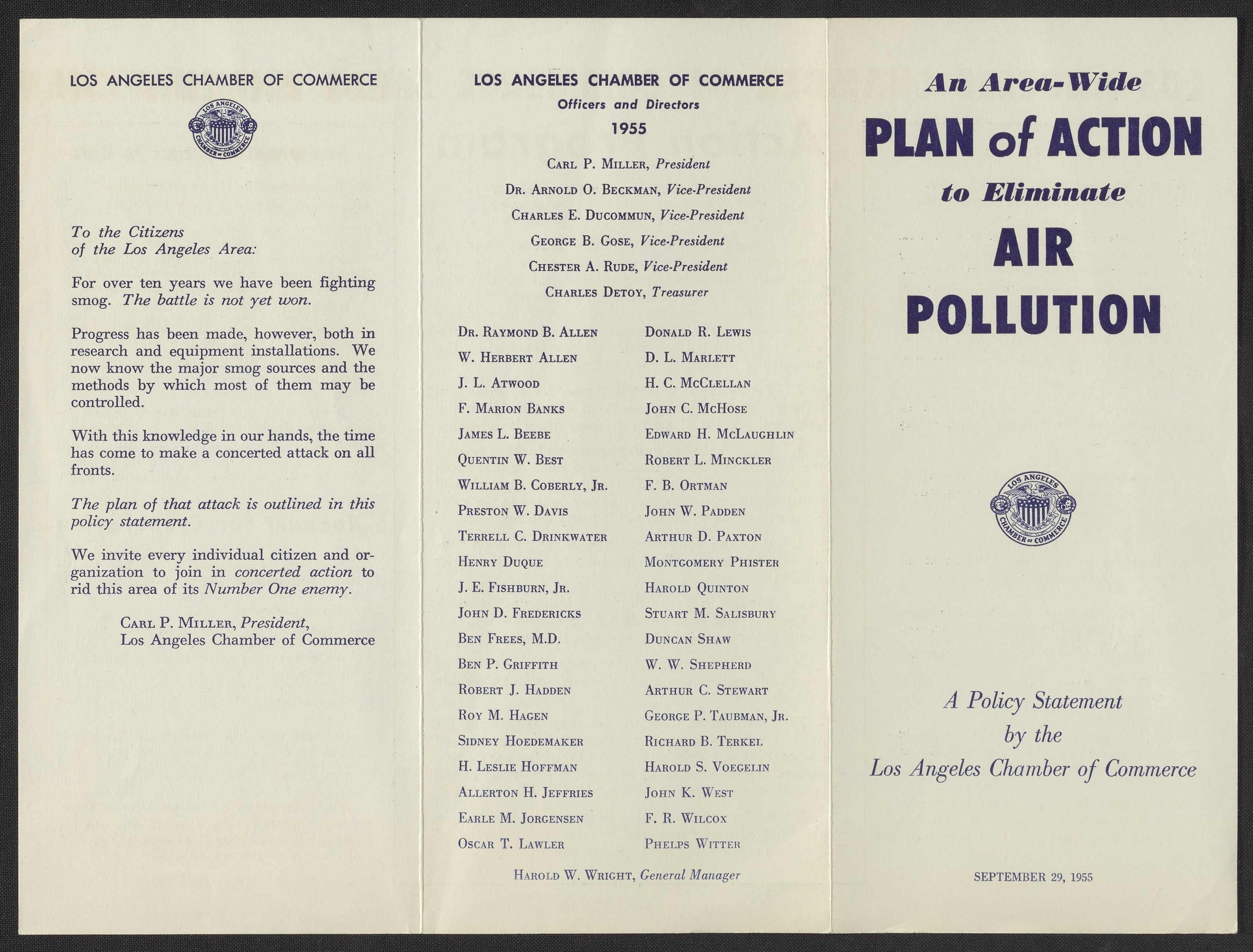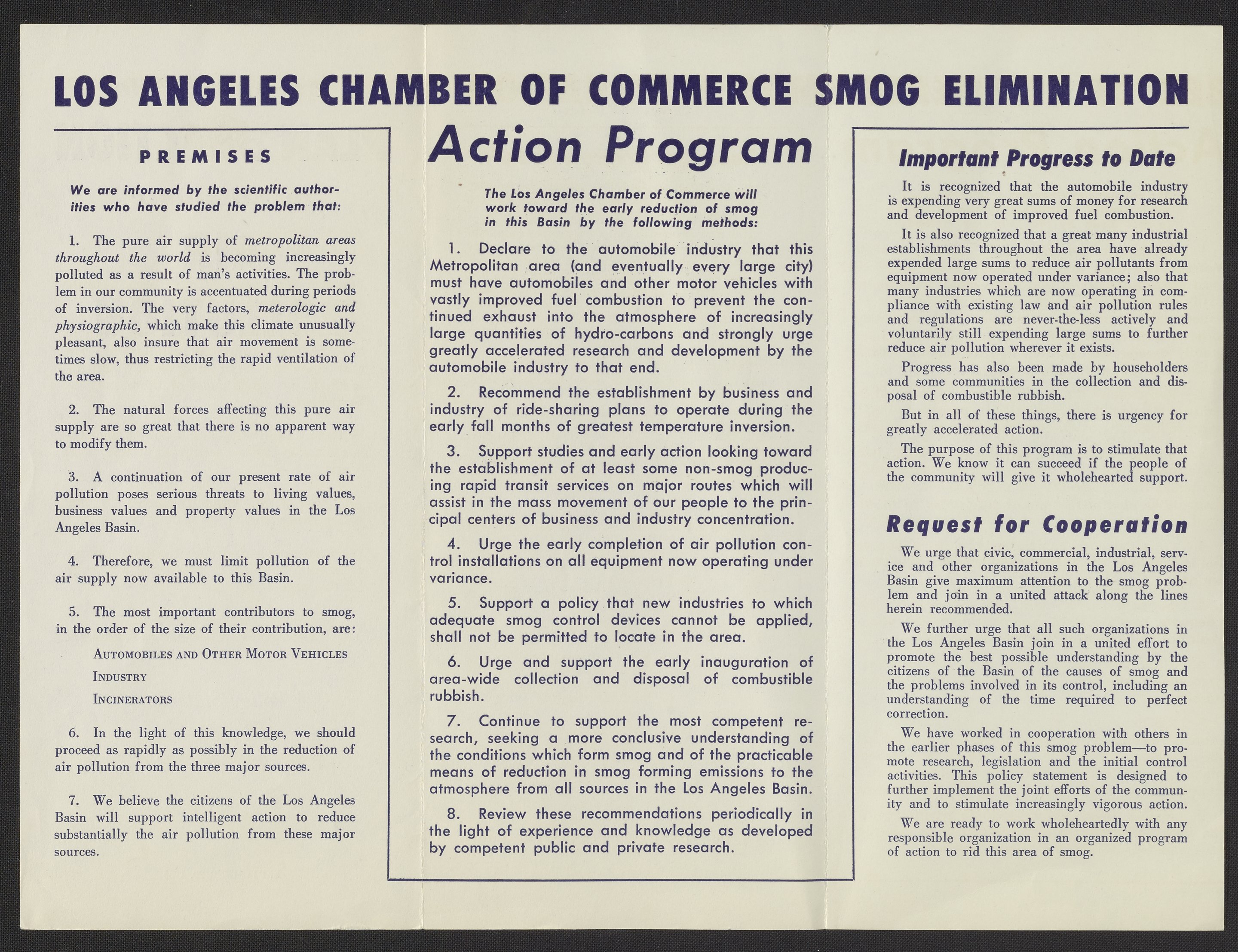 This trifold brochure lays out the scientific findings about the problem of smog in Los Angeles, as well as a plan for action, progress to date, and a request for cooperation.