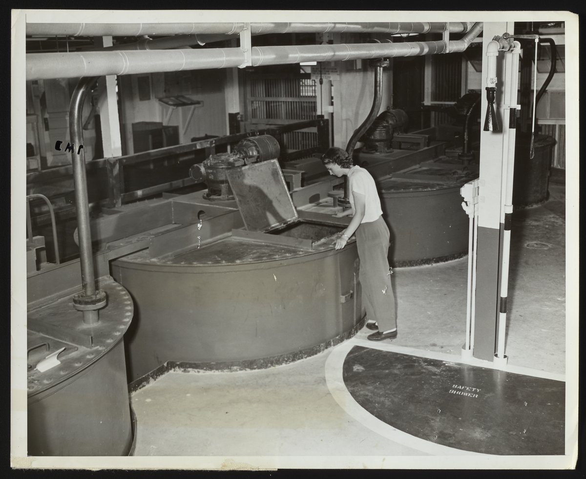 General view of an unidentified female employee inspecting a treating tub used to purify ethyl cellulose at the Hercules Powder Company plant in Hopewell, Virginia. The Hopewell plant commonly produced ethyl cellulose, which was purchased by a variety of public and private industries as a raw material for use in plastics, films, lacquers, and other materials. Notably, a safety shower apparatus is visible on the right-hand side of the photograph.