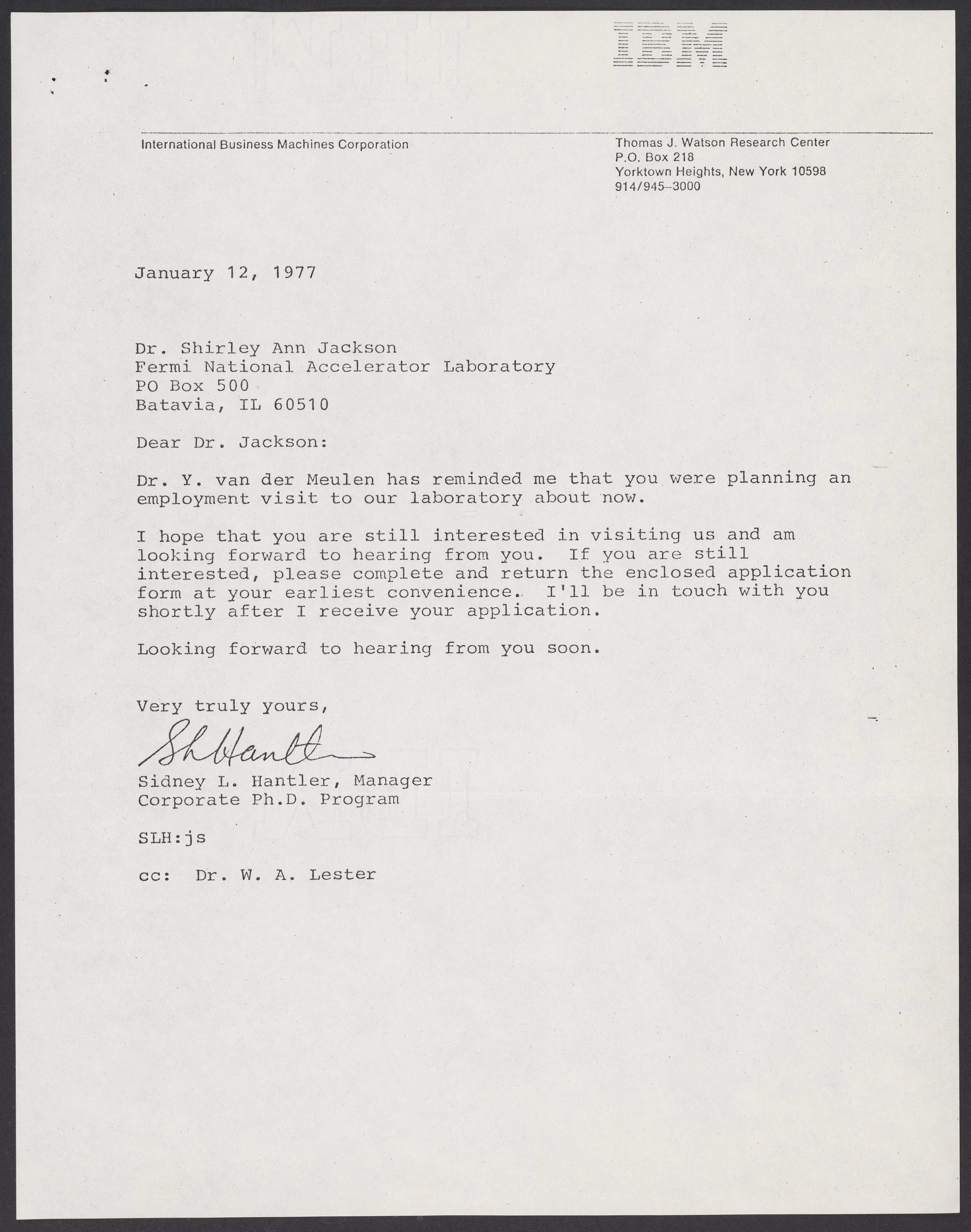 Hantler, Sidney L. “Letter from Sidney L. Hantler to Shirley Ann Jackson, January 1977,” January 12, 1977. William A. Lester, Jr. Papers, Box 1, Folder 39. Science History Institute. Philadelphia. https://digital.sciencehistory.org/works/xddx7j9.